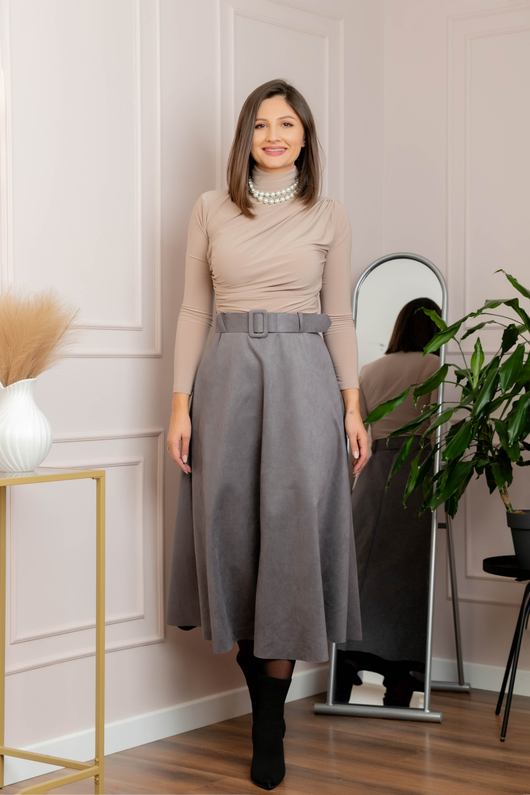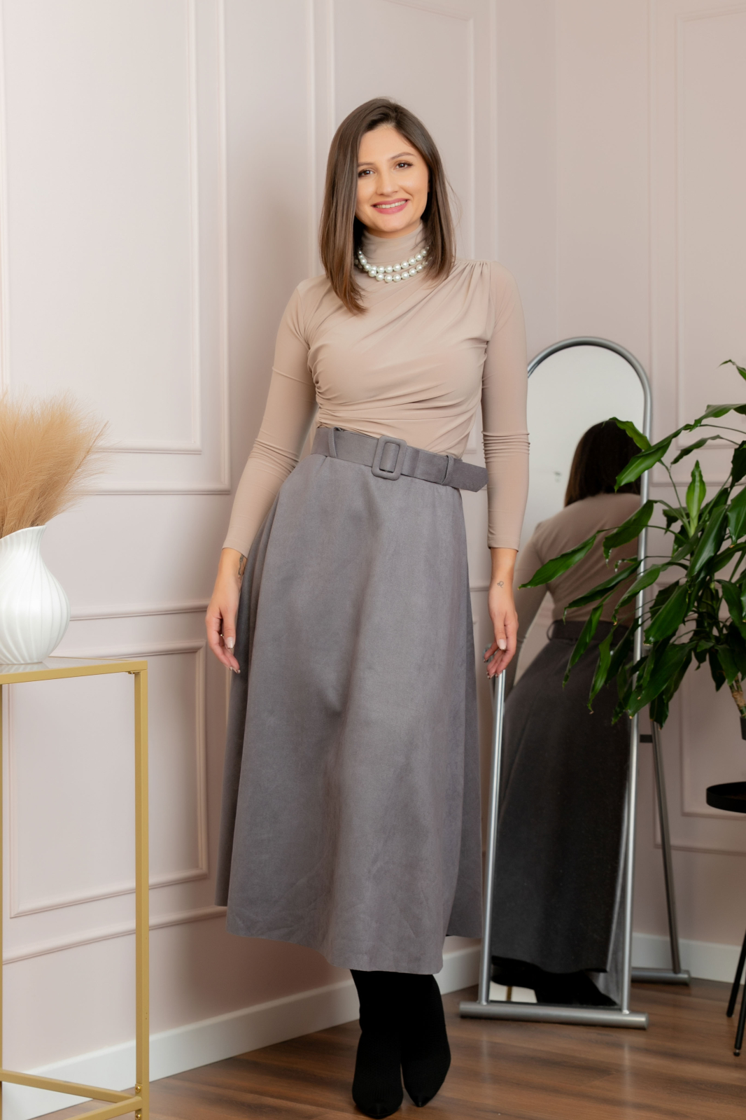 Fusta lunga din piele intoarsa ecologica, cu croi clos si centura in talie. Eleganta si confortabila, ideala pentru tinute de toamna, iarna si primavara.