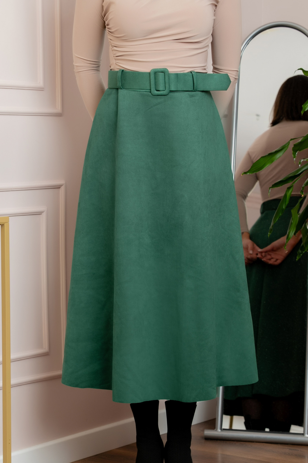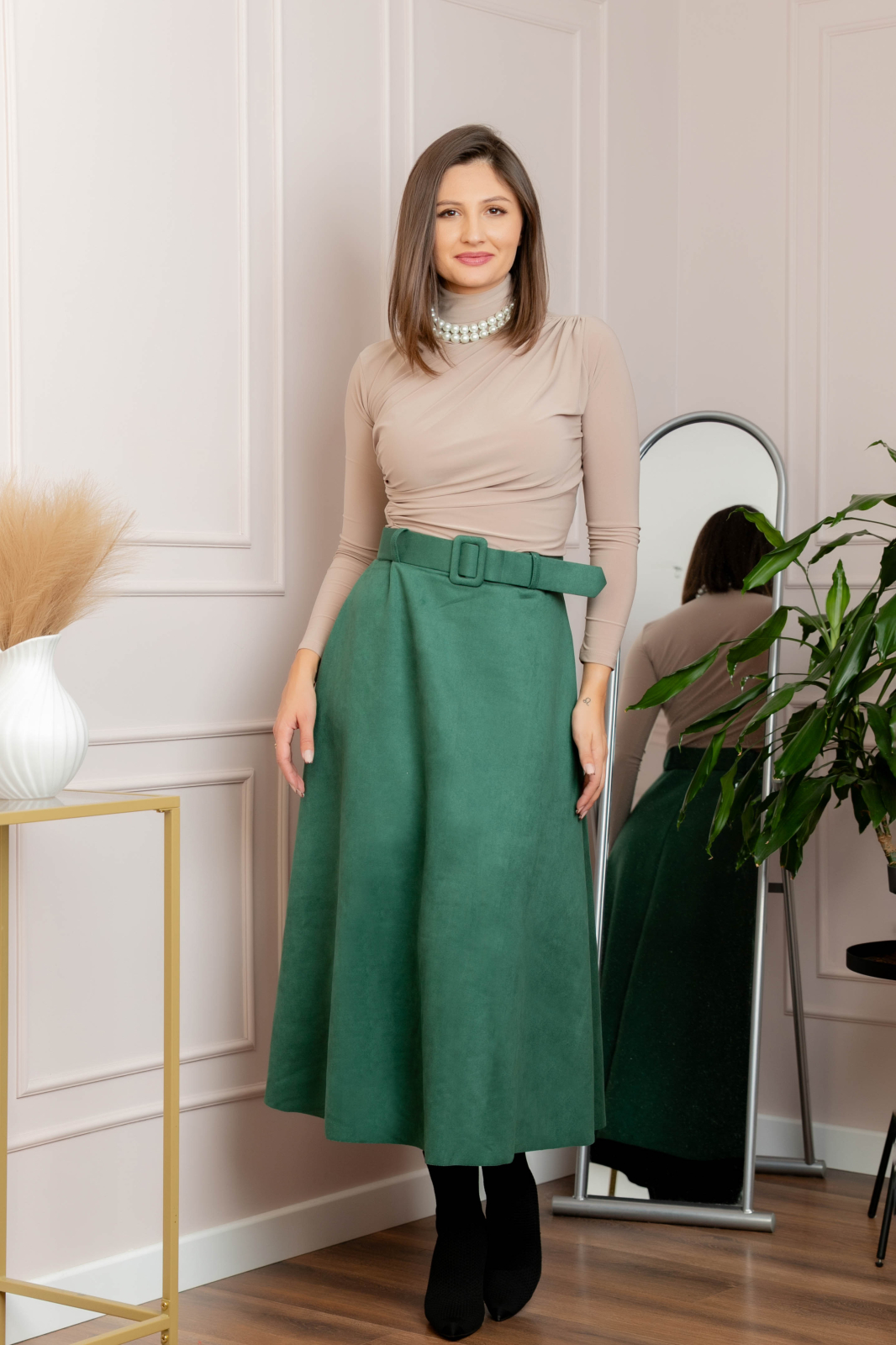 Fusta lunga Kristen este o piesa eleganta si versatila, confectionata din piele intoarsa ecologica cu textura fina. Croiul clos ofera libertate de miscare si o alura feminina, iar centura lata in talie evidentiaza frumos silueta. Este o alegere ideala pentru zilele racoroase in care vrei sa imbini rafinamentul cu confortul.