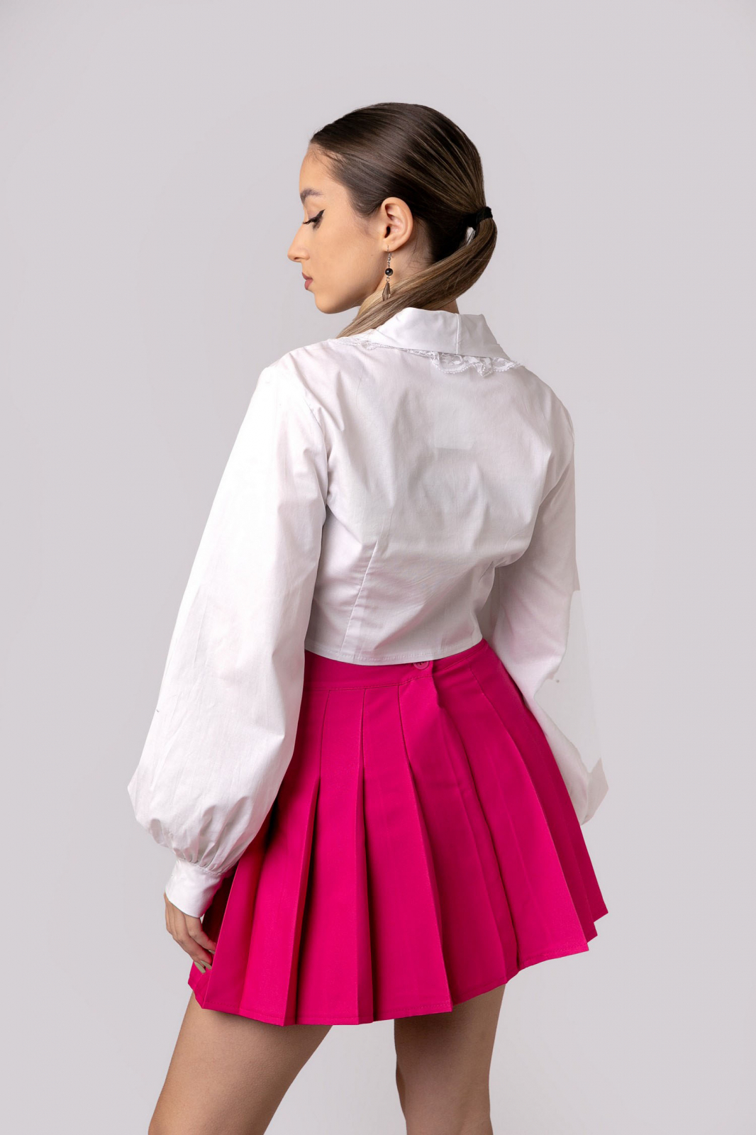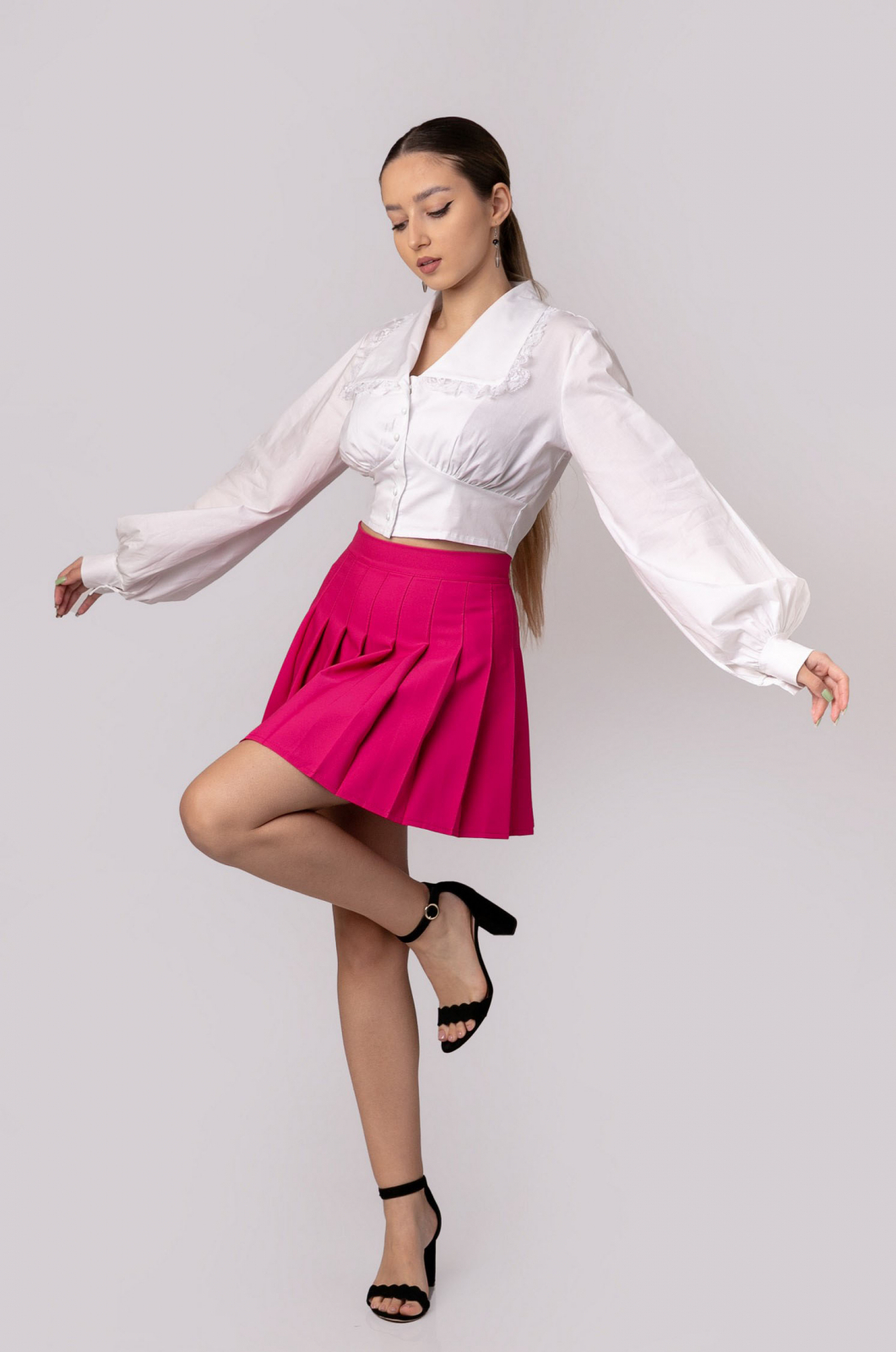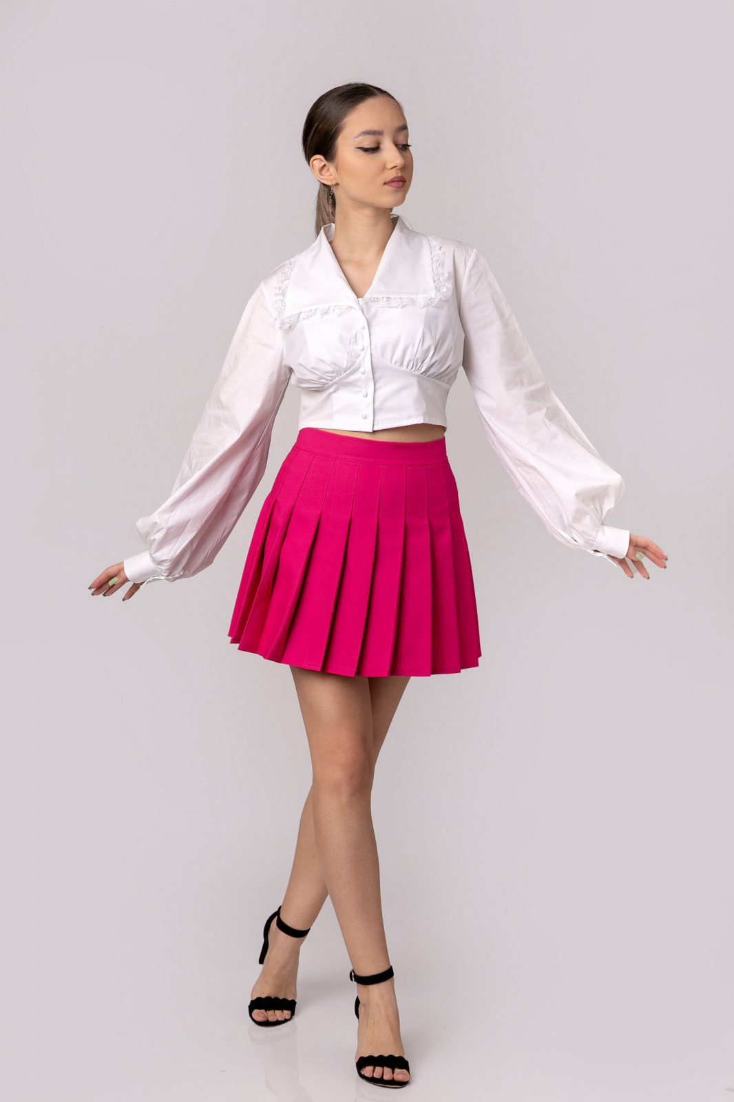 Fusta mini cu pliuri, talie inalta si inchidere cu nasture si fermoar la spate.