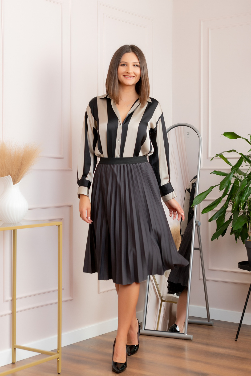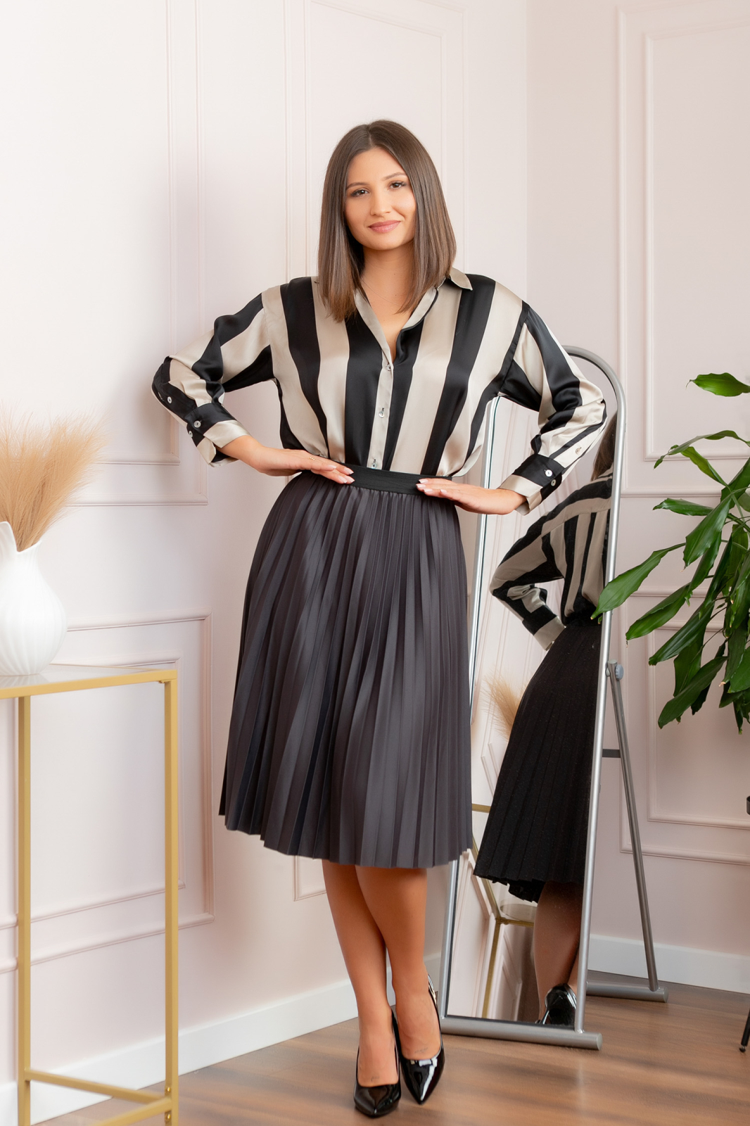 Fusta gri antracit cu croi plisat, talie inalta si elastic in talie. Betelia este elastica si acomodeaza mai multe marimi. Nu se sifoneaza, nu necesita calcare.