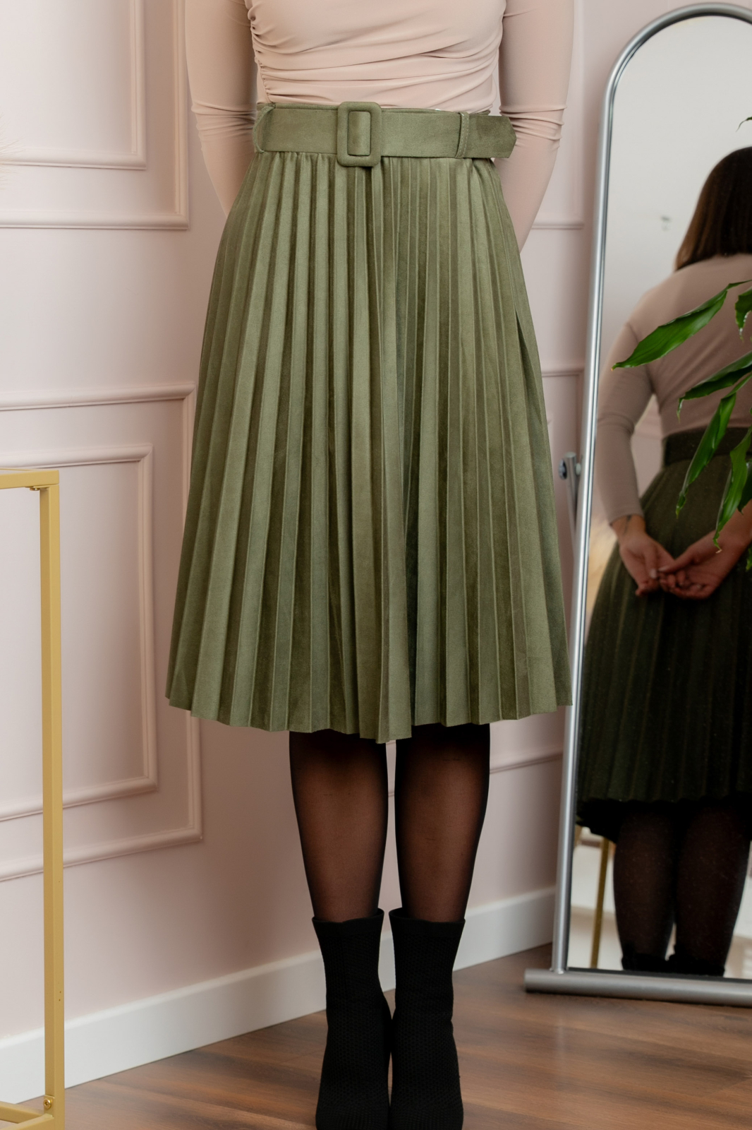 Fusta plisata Rebecca este o alegere eleganta si feminina, ideala pentru zilele racoroase in care vrei sa imbini confortul cu stilul. Croiul sau midi si textura fina din piele intoarsa ecologica ofera o tinuta moderna, potrivita atat pentru birou, cat si pentru iesiri casual.