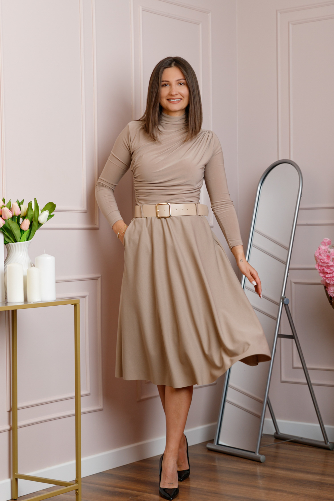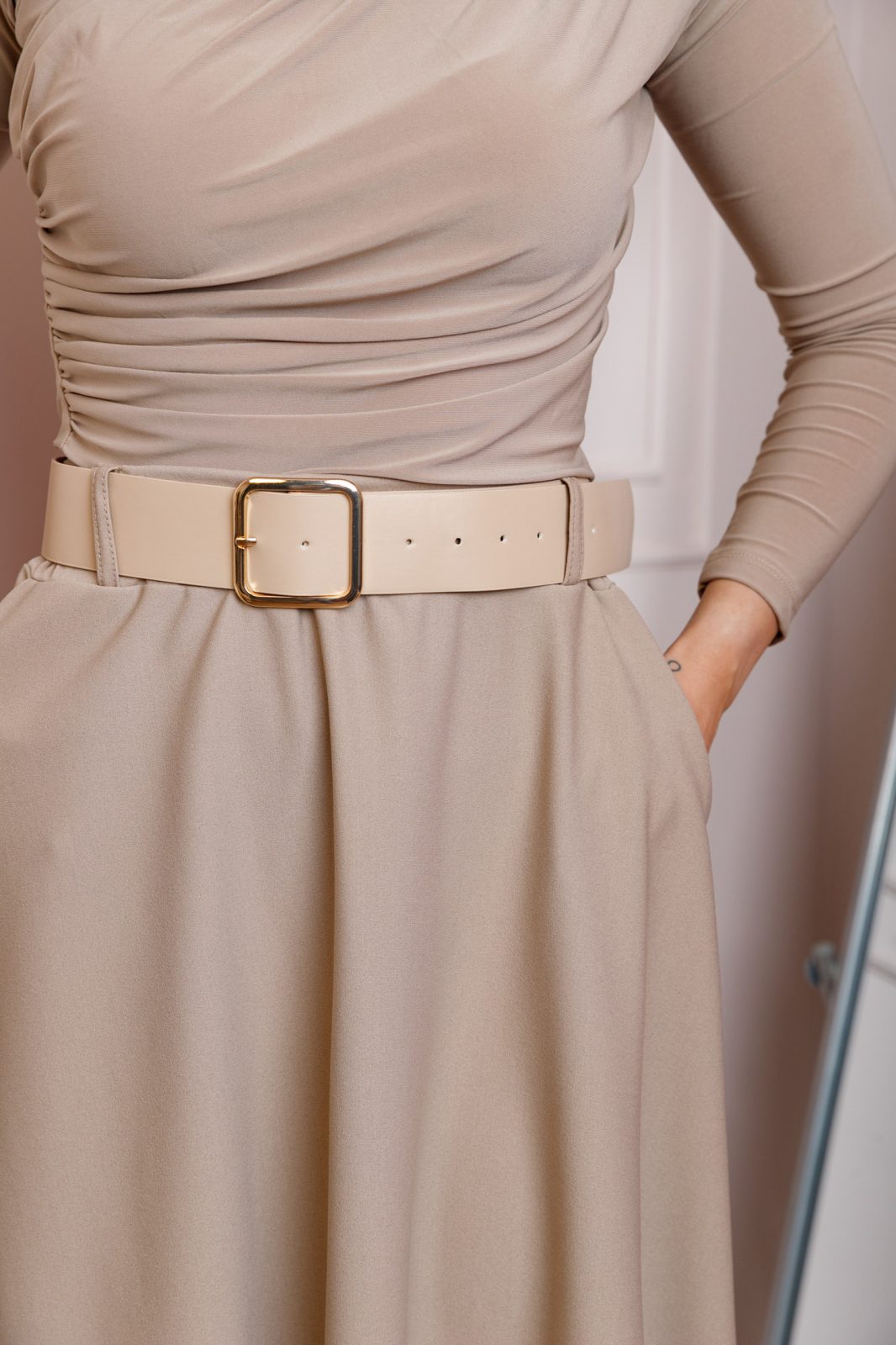 Fusta bej midi cu talie inalta, curea si buzunare laterale Isla