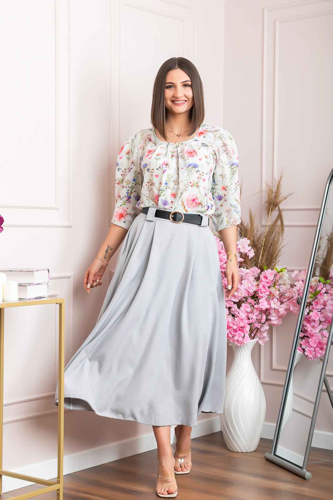 Acest model de fusta este alegerea perfecta daca vrei un look feminin si relaxat, dar totodata rafinat. Croita lejer in clos dintr-un material opac, usor si fluid, piesa cade frumos pe linia corpului si flateaza orice silueta. Talia este inalta, evidentiata de o curea neagra detasabila cu catarama rotunda aurie, iar la spate are un elastic discret ce asigura confort pe tot parcursul zilei si se adapteaza usor diferitelor masuri. In fata, pliurile subtile adauga volum si miscare, transformand fiecare pas intr‑un detaliu elegant. Buzunarele laterale sunt complet functionale, utile pentru telefon sau mici obiecte, fara a compromite linia curata a designului. Nuanta versatila se asorteaza usor atat cu topuri colorate, cat si cu piese clasice neutre, ceea ce face fusta ideala pentru birou, iesiri in oras sau evenimente de primavara‑vara. Lungimea midi iti lasa gleznele libere pentru sandale cu barete sau pantofi cu toc mediu, iar materialul nu este transparent, asa ca poti purta fusta fara captuseala suplimentara. Modelul din imagine are 174 cm inaltime.
