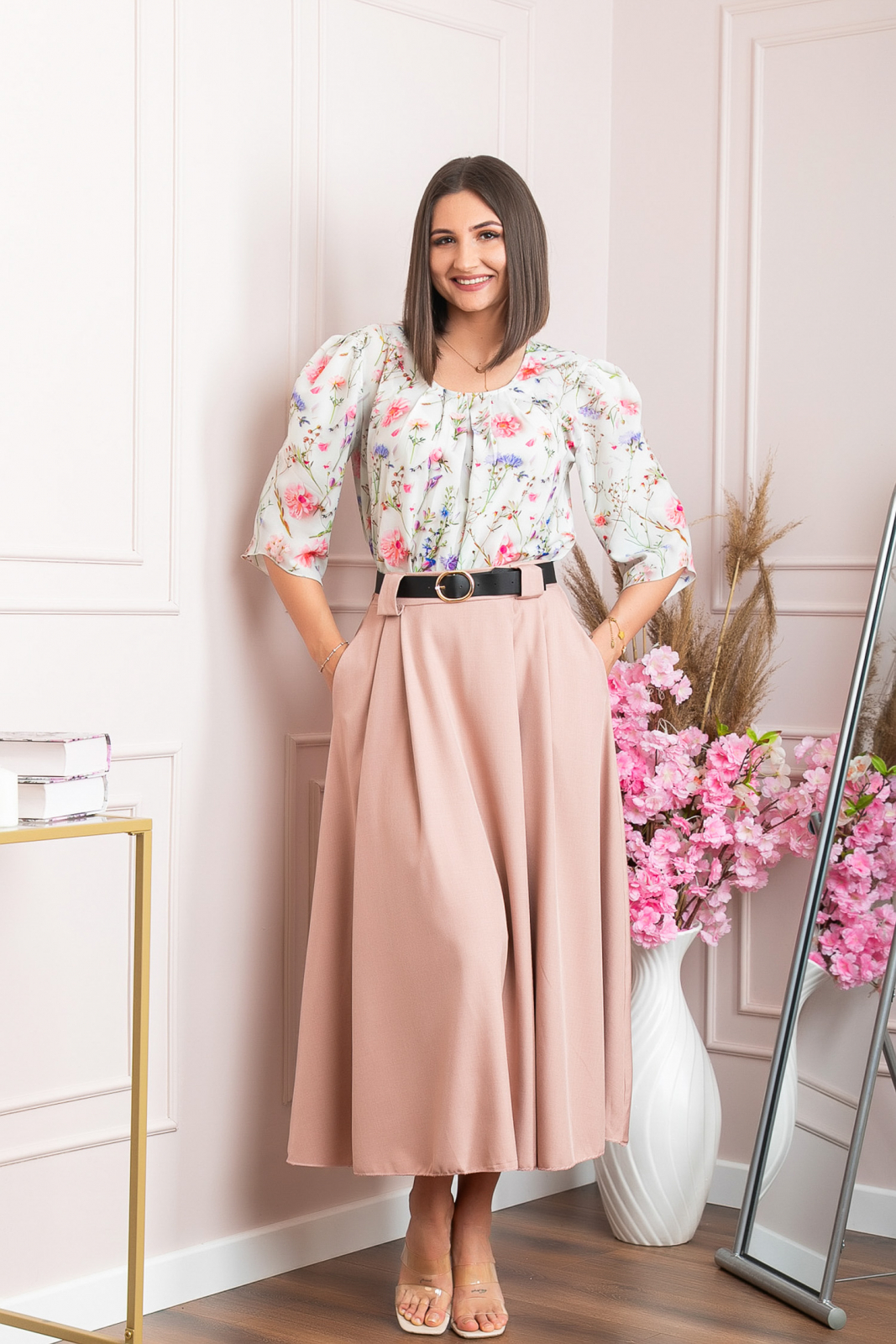 Acest model de fusta este alegerea perfecta daca vrei un look feminin si relaxat, dar totodata rafinat. Croita lejer in clos dintr-un material opac, usor si fluid, piesa cade frumos pe linia corpului si flateaza orice silueta. Talia este inalta, evidentiata de o curea neagra detasabila cu catarama rotunda aurie, iar la spate are un elastic discret ce asigura confort pe tot parcursul zilei si se adapteaza usor diferitelor masuri. In fata, pliurile subtile adauga volum si miscare, transformand fiecare pas intr‑un detaliu elegant. Buzunarele laterale sunt complet functionale, utile pentru telefon sau mici obiecte, fara a compromite linia curata a designului. Nuanta versatila se asorteaza usor atat cu topuri colorate, cat si cu piese clasice neutre, ceea ce face fusta ideala pentru birou, iesiri in oras sau evenimente de primavara‑vara. Lungimea midi iti lasa gleznele libere pentru sandale cu barete sau pantofi cu toc mediu, iar materialul nu este transparent, asa ca poti purta fusta fara captuseala suplimentara. Modelul din imagine are 174 cm inaltime.