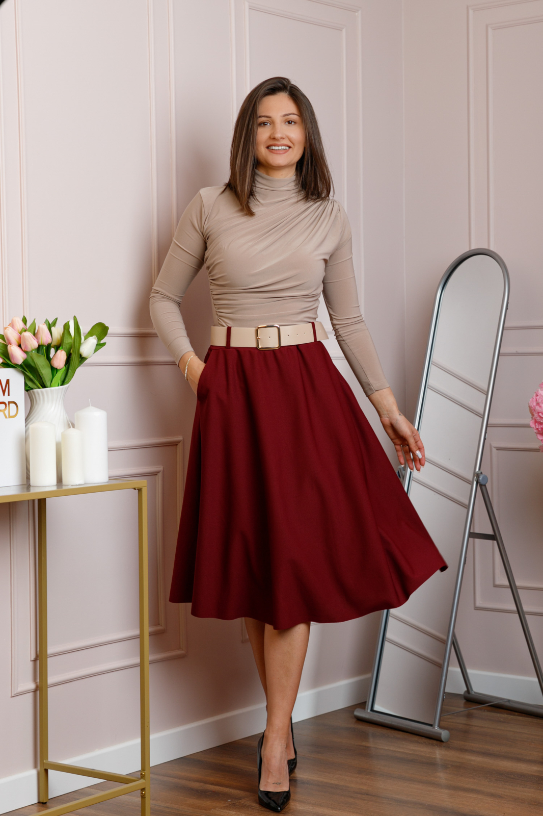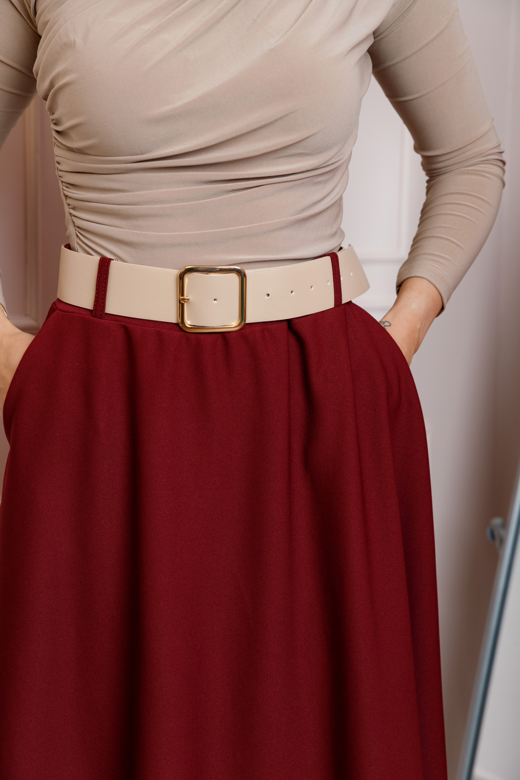 Lungimea midi ofera un echilibru perfect intre eleganta si confort, fiind potrivita atat pentru tinute office, cat si pentru aparitii casual rafinate. Materialul este suficient de dens si opac, astfel incat nu necesita captuseala, pastrand totodata o cadere fluida si placuta.