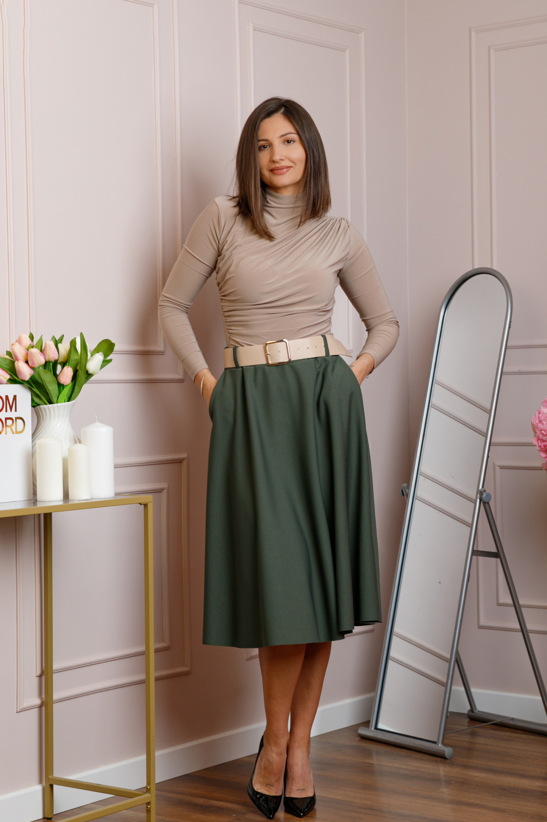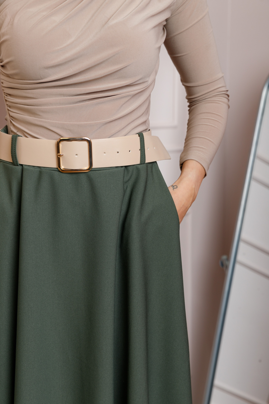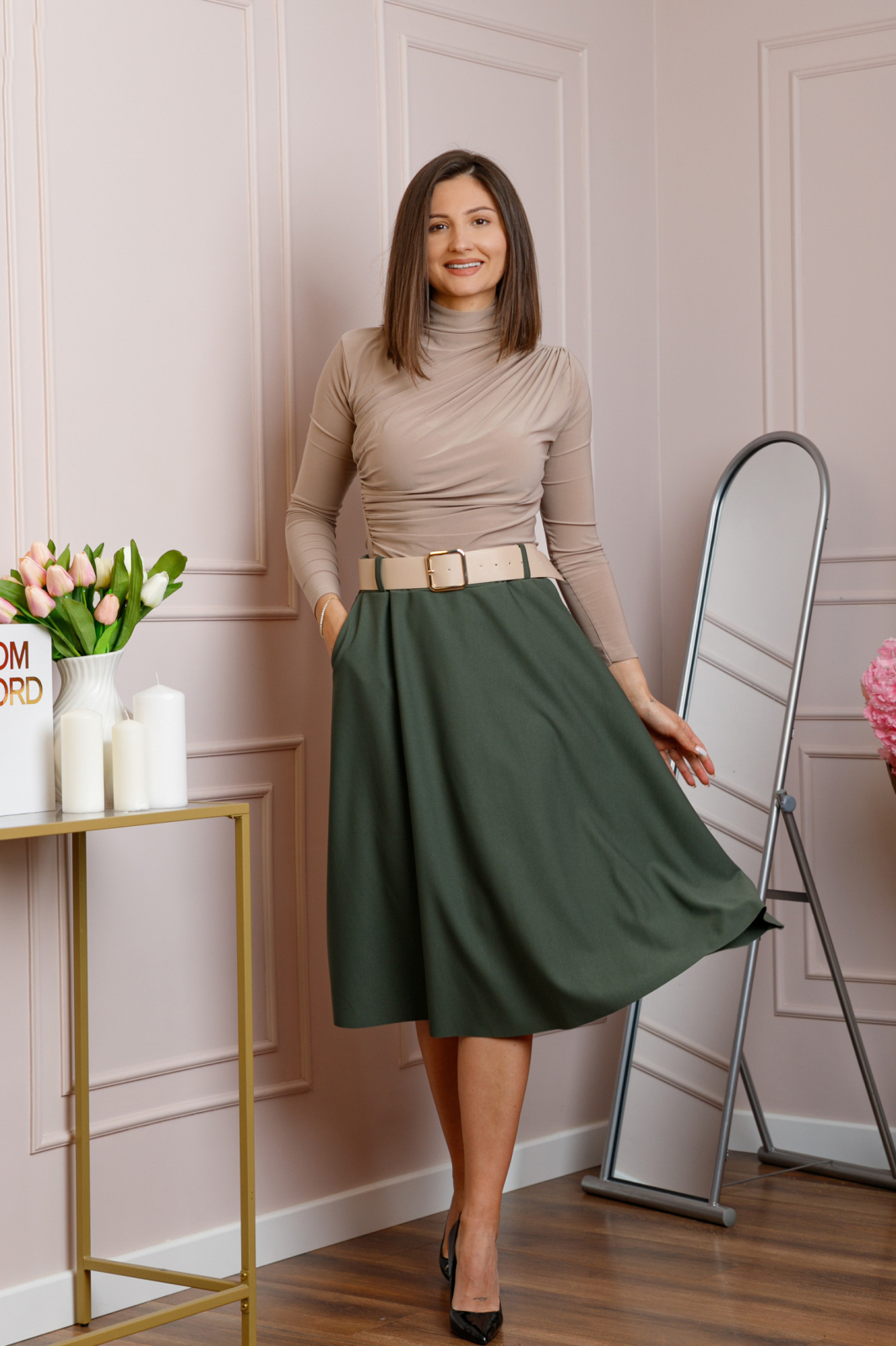 Lungimea midi ofera un echilibru perfect intre eleganta si confort, fiind potrivita atat pentru tinute office, cat si pentru aparitii casual rafinate. Materialul este suficient de dens si opac, astfel incat nu necesita captuseala, pastrand totodata o cadere fluida si placuta.