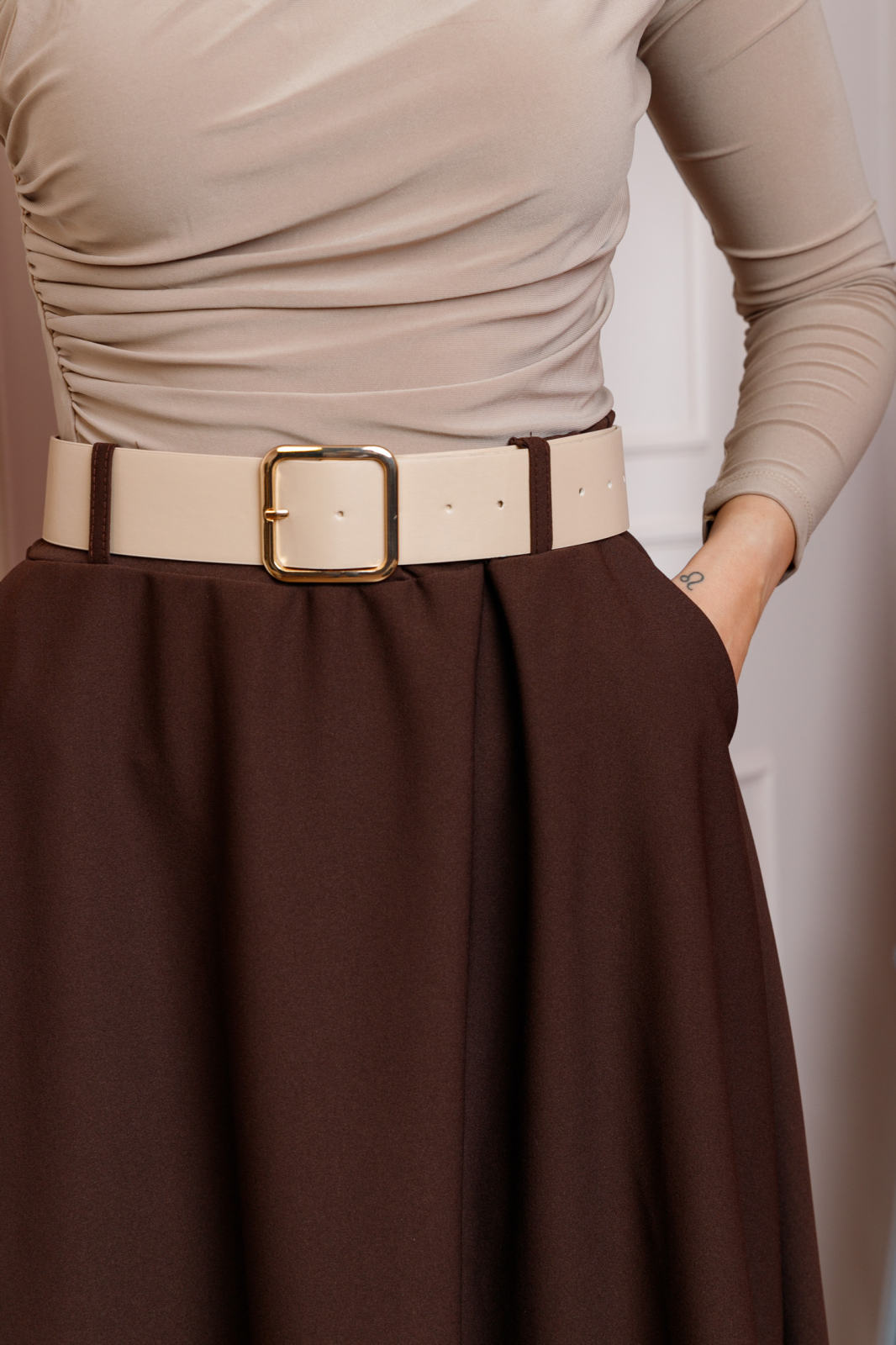 Lungimea midi ofera un echilibru perfect intre eleganta si confort, fiind potrivita atat pentru tinute office, cat si pentru aparitii casual rafinate. Materialul este suficient de dens si opac, astfel incat nu necesita captuseala, pastrand totodata o cadere fluida si placuta.