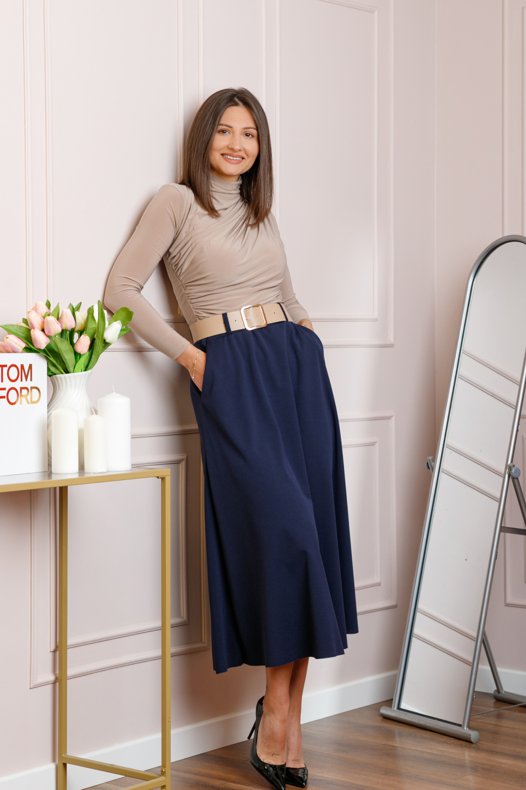 Fusta Ivy este o piesa versatila si eleganta, ideala pentru tinute rafinate de zi sau de seara. Croiala midi, cu talie inalta, evidentiaza silueta si ofera un echilibru perfect intre confort si stil.