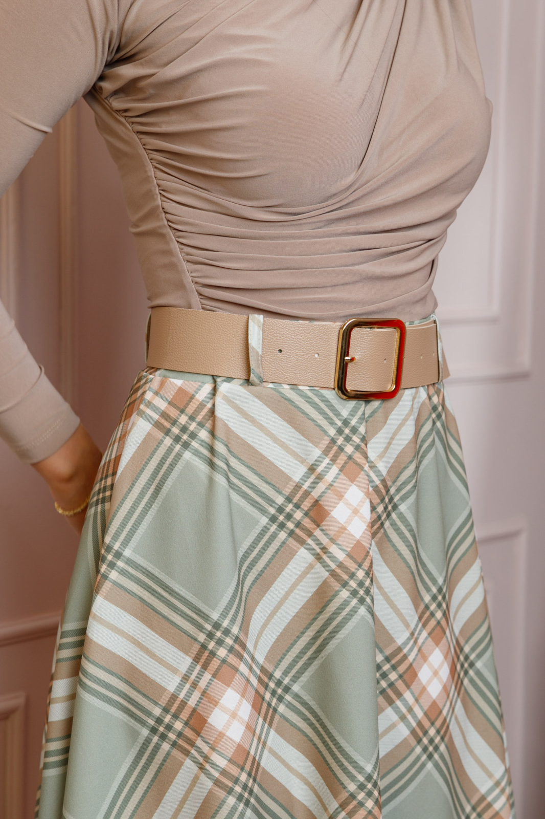 Imprimeul in carouri, in nuante echilibrate de verde, bej si crem, adauga un plus de stil si versatilitate, fiind usor de asortat atat cu piese neutre, cat si cu tonuri calde.