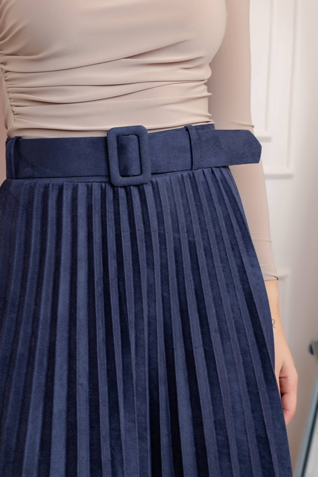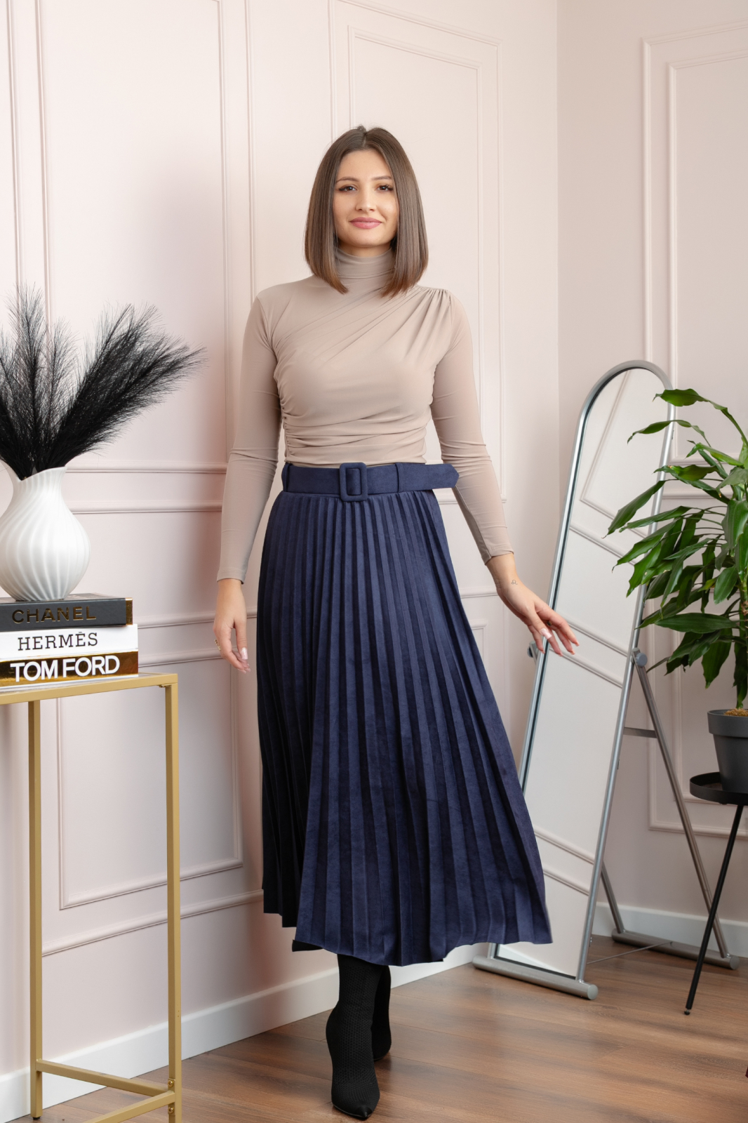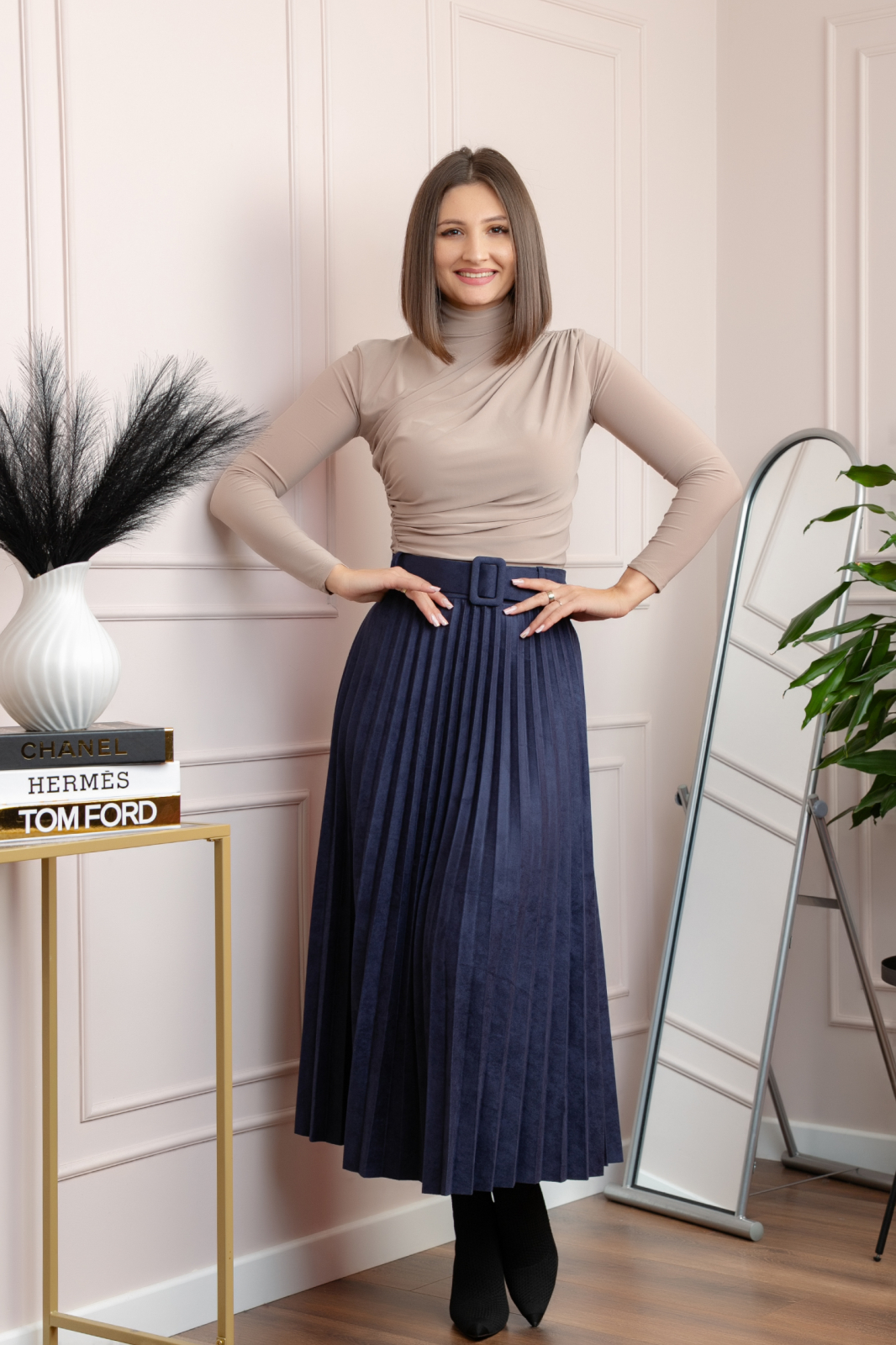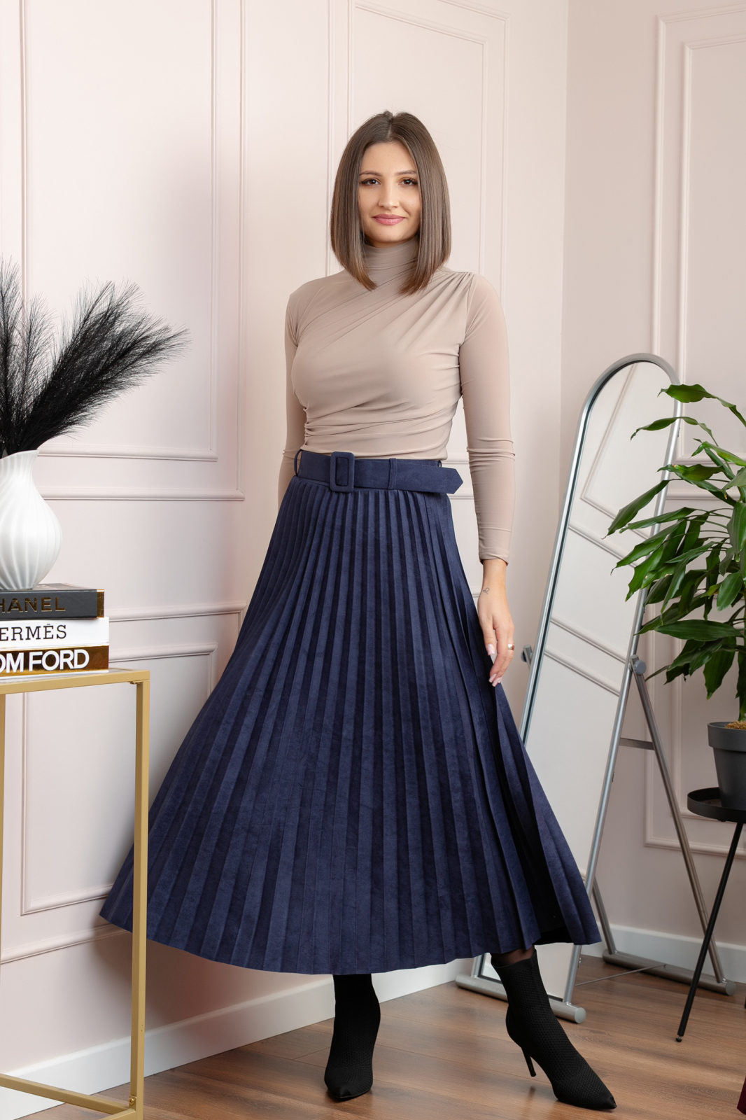 Fusta Delilah impresioneaza prin eleganta clasica si rafinamentul detaliilor. Realizata din piele intoarsa ecologica fina (95% poliester, 5% elastan), aceasta fusta midi are o textura moale, catifelata si un croi plisat care pune in valoare feminitatea. Centura in talie adauga un accent modern si subliniaza frumos silueta.