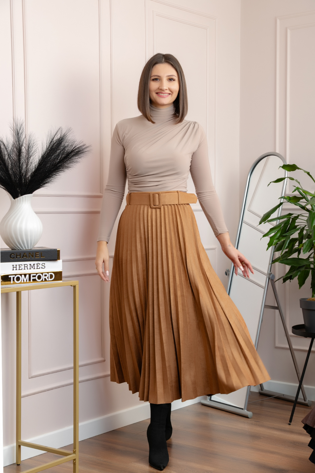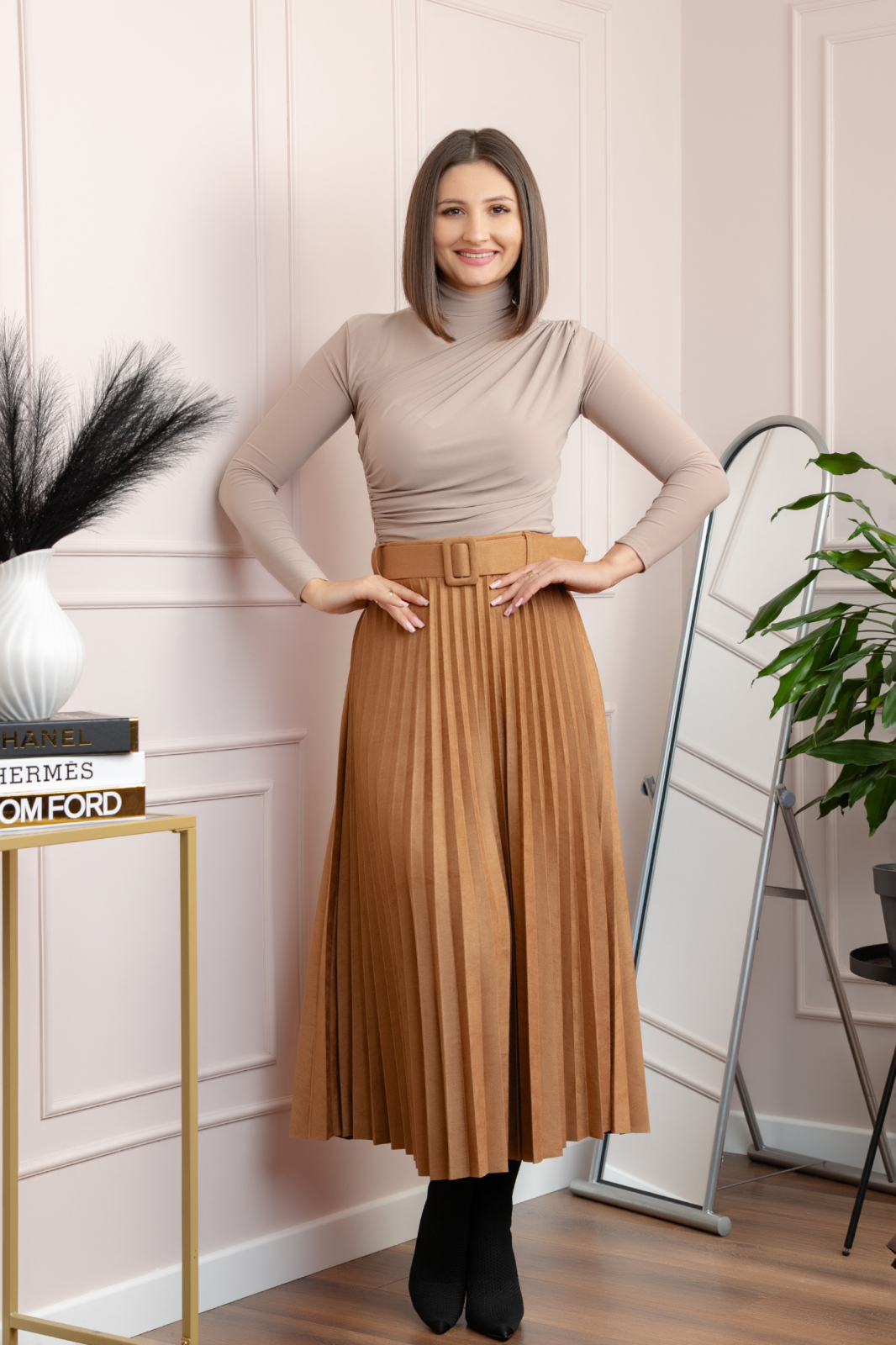 Fusta Delilah impresioneaza prin eleganta clasica si rafinamentul detaliilor. Realizata din piele intoarsa ecologica fina (95% poliester, 5% elastan), aceasta fusta midi are o textura moale, catifelata si un croi plisat care pune in valoare feminitatea. Centura in talie adauga un accent modern si subliniaza frumos silueta.
