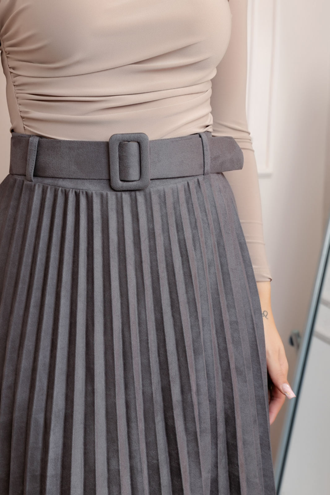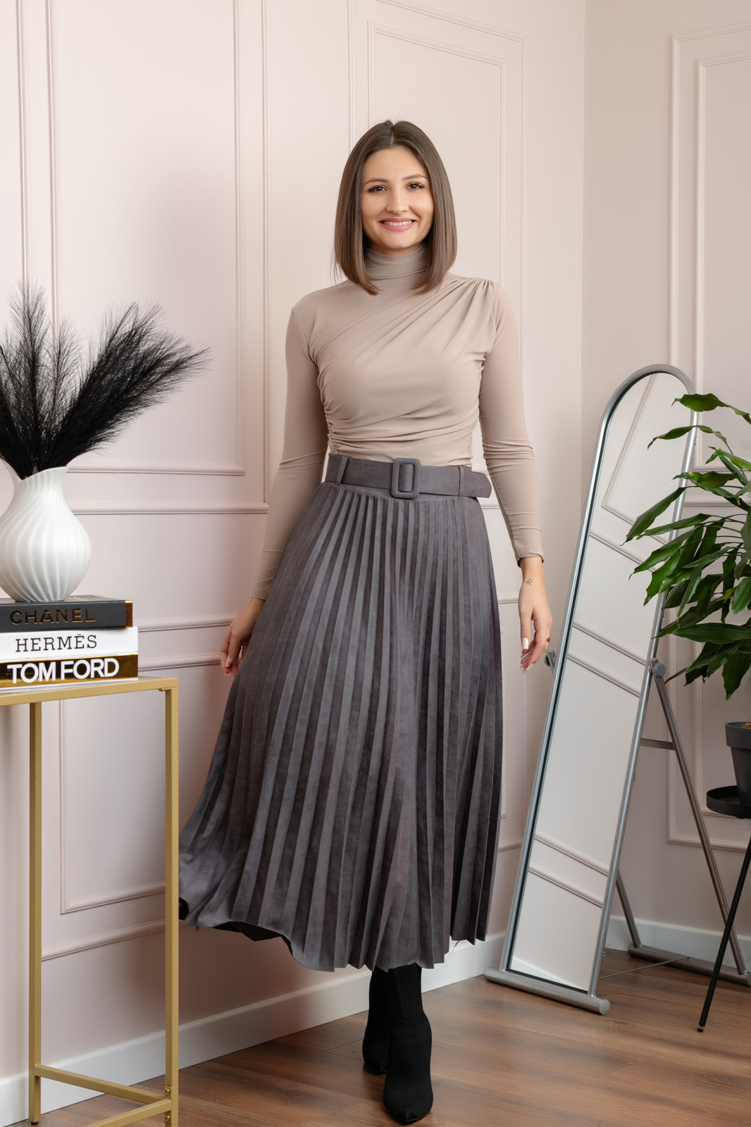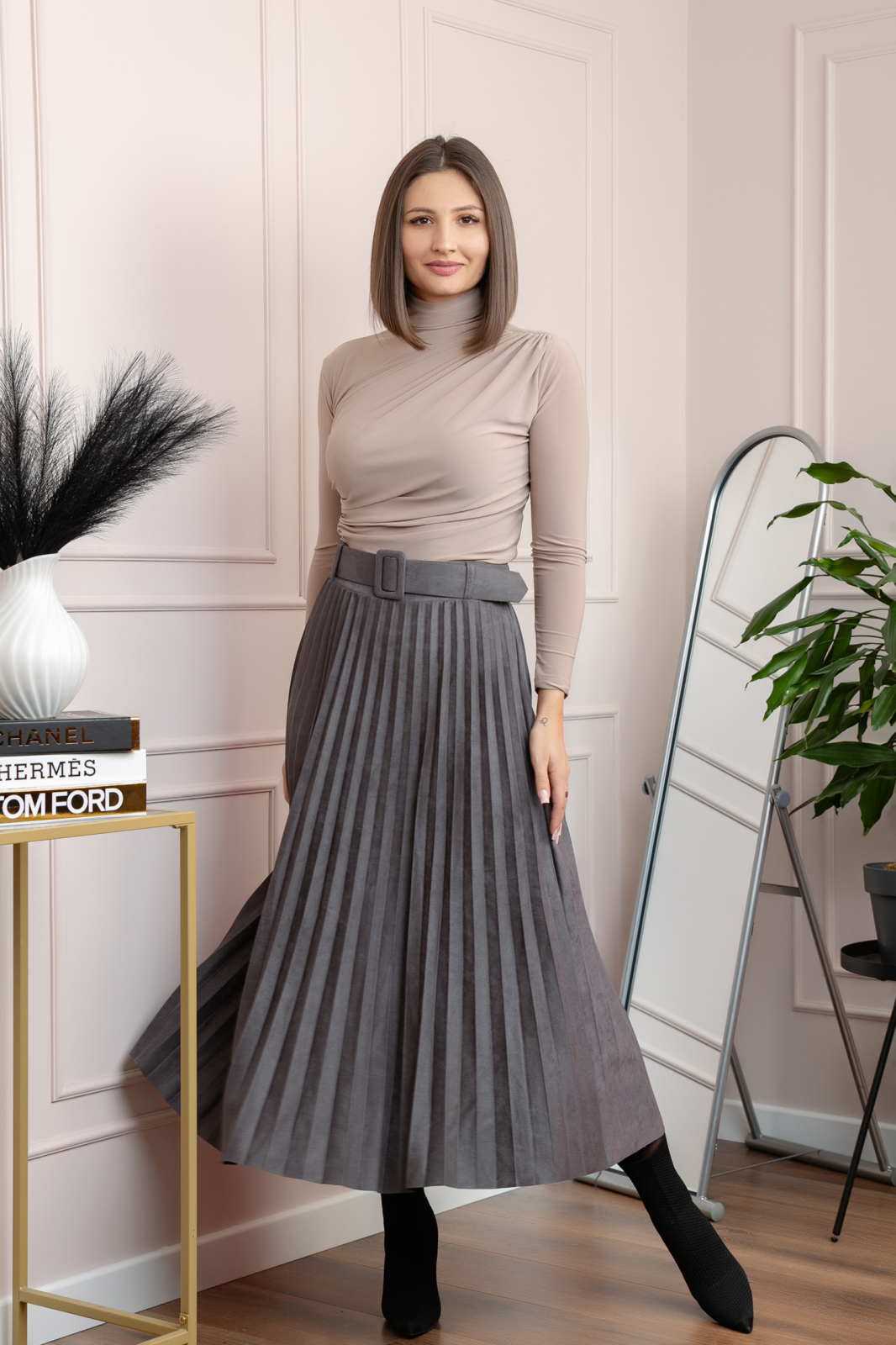 Fusta Delilah impresioneaza prin eleganta clasica si rafinamentul detaliilor. Realizata din piele intoarsa ecologica fina (95% poliester, 5% elastan), aceasta fusta midi are o textura moale, catifelata si un croi plisat care pune in valoare feminitatea. Centura in talie adauga un accent modern si subliniaza frumos silueta.