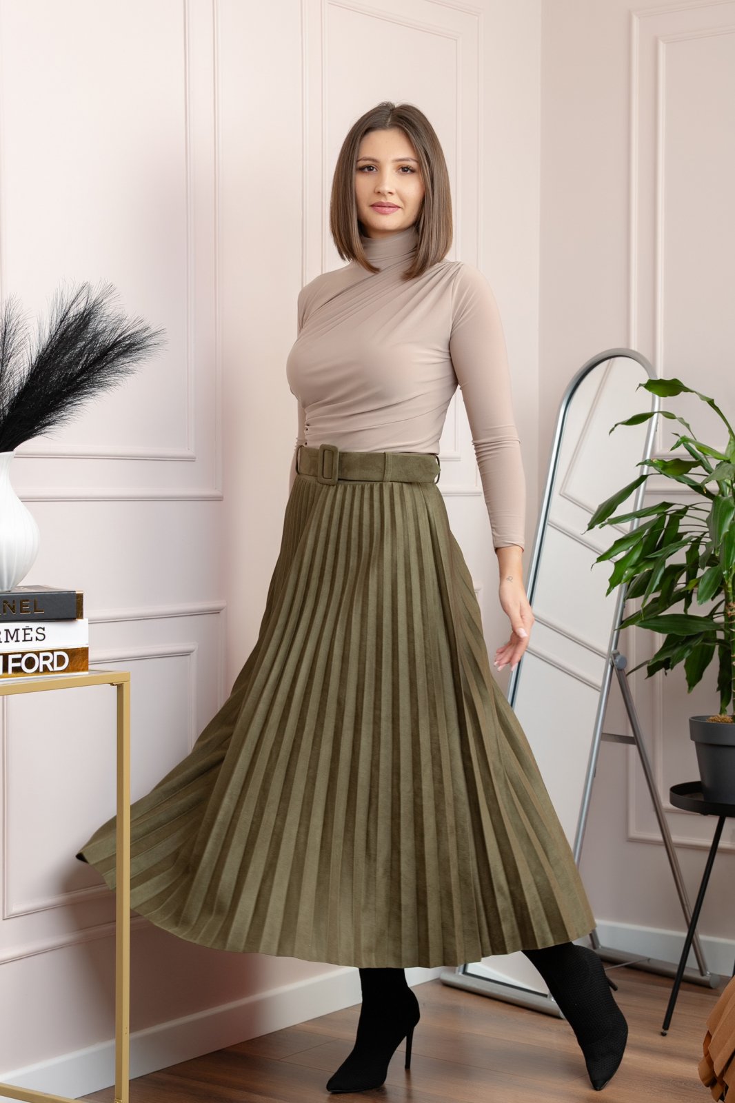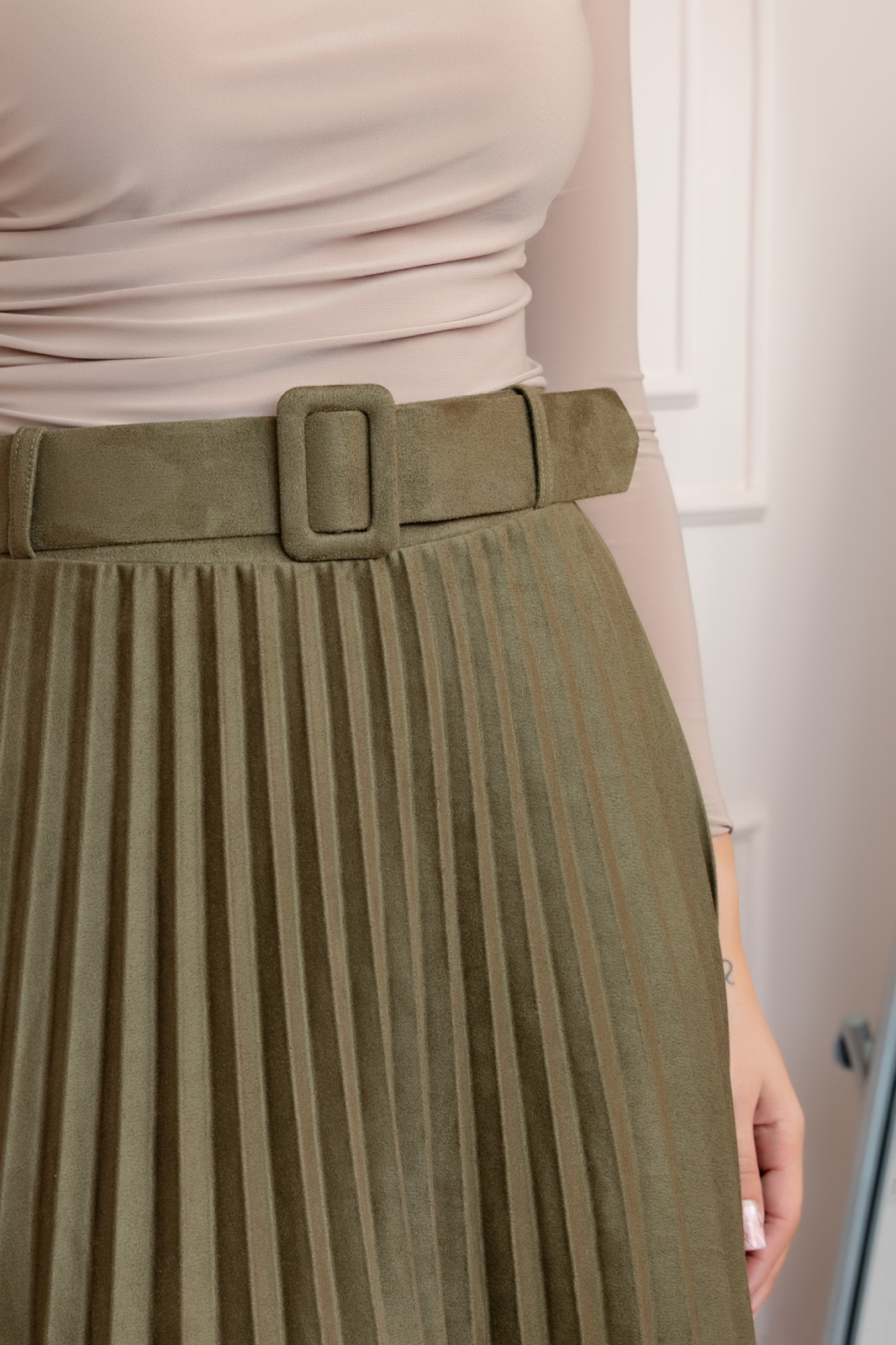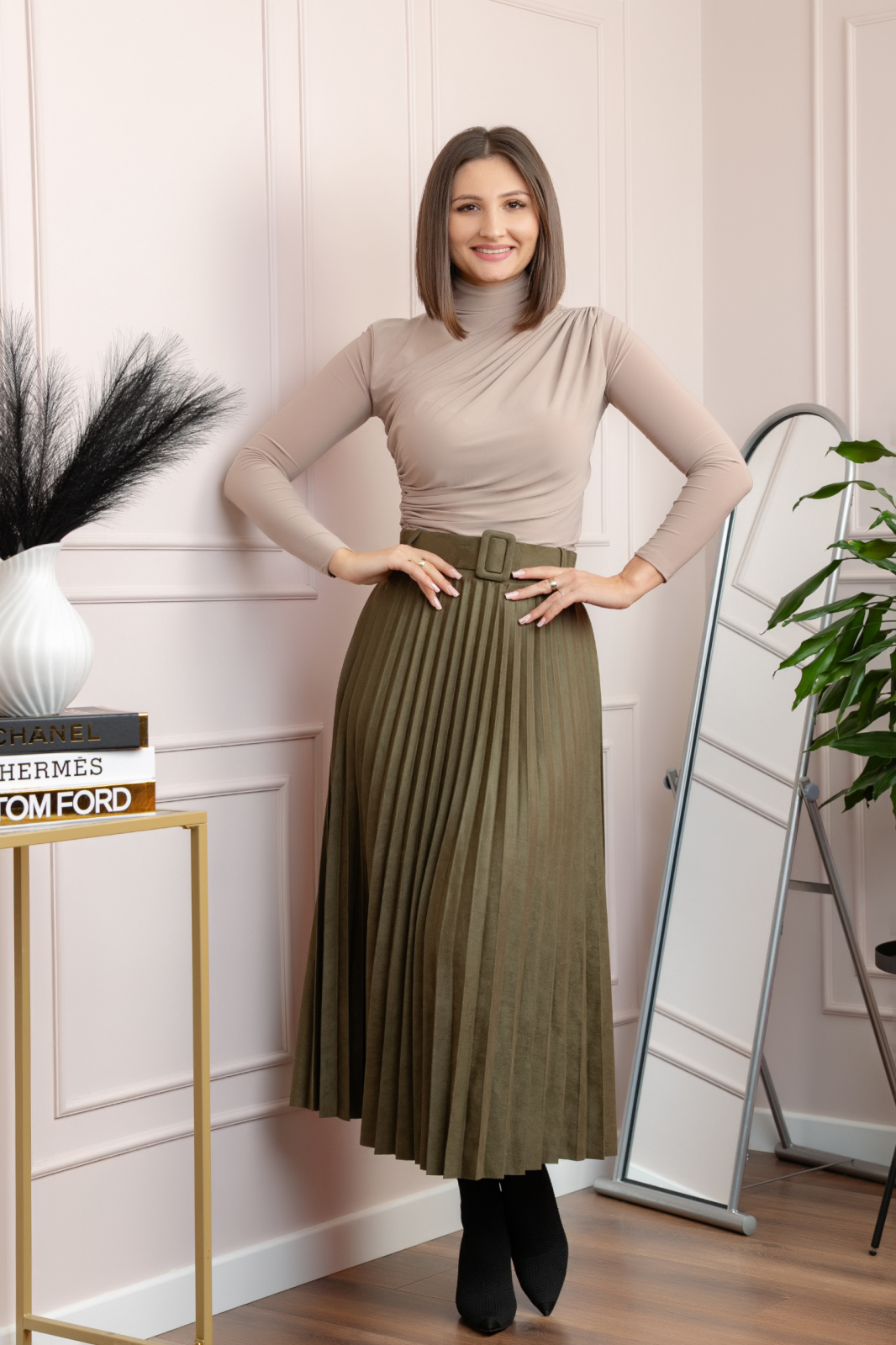 Fusta Delilah impresioneaza prin eleganta clasica si rafinamentul detaliilor. Realizata din piele intoarsa ecologica fina (95% poliester, 5% elastan), aceasta fusta midi are o textura moale, catifelata si un croi plisat care pune in valoare feminitatea. Centura in talie adauga un accent modern si subliniaza frumos silueta.