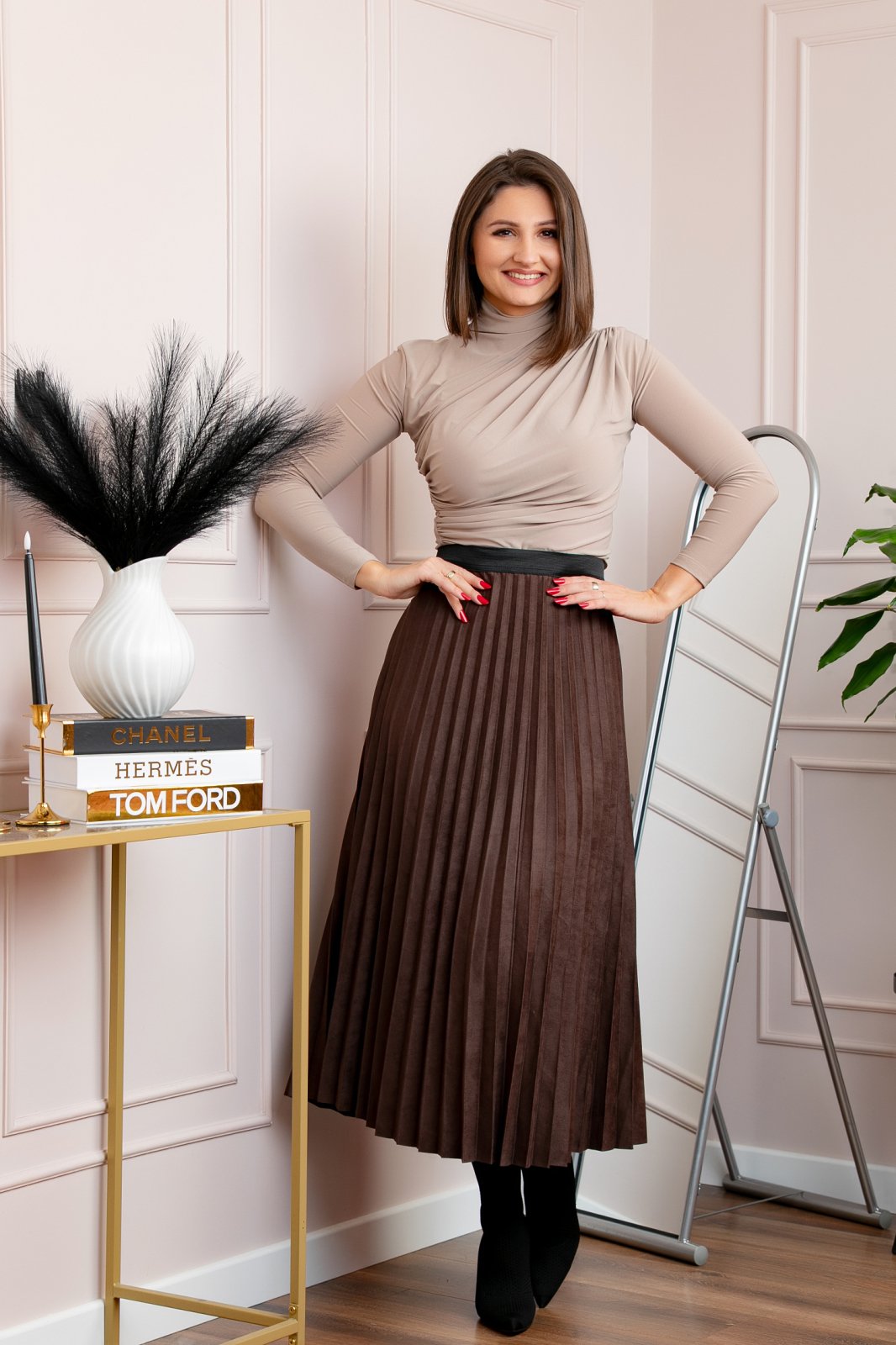 Fusta midi plisata Shannon din piele intoarsa ecologica - Maro