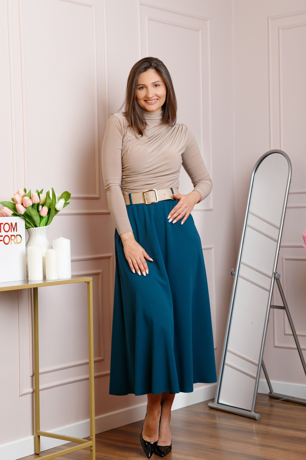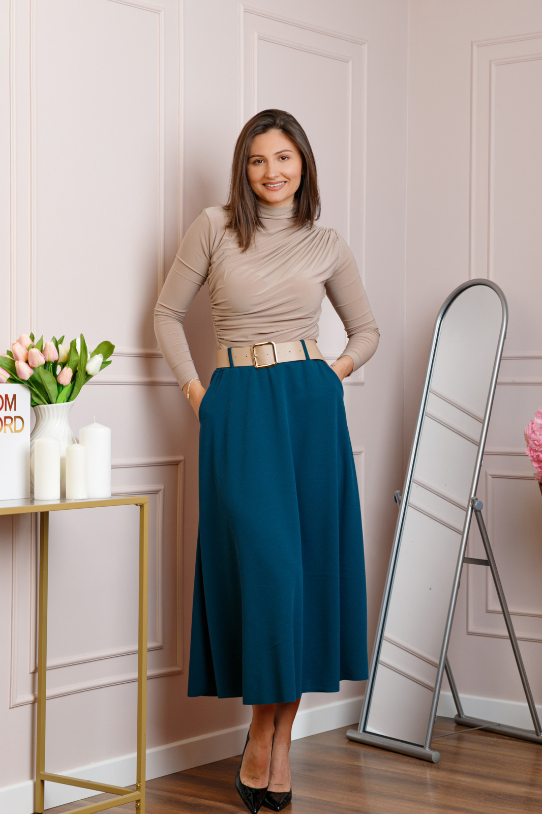 Fusta Ivy este o piesa versatila si eleganta, ideala pentru tinute rafinate de zi sau de seara. Croiala midi, cu talie inalta, evidentiaza silueta si ofera un echilibru perfect intre confort si stil.