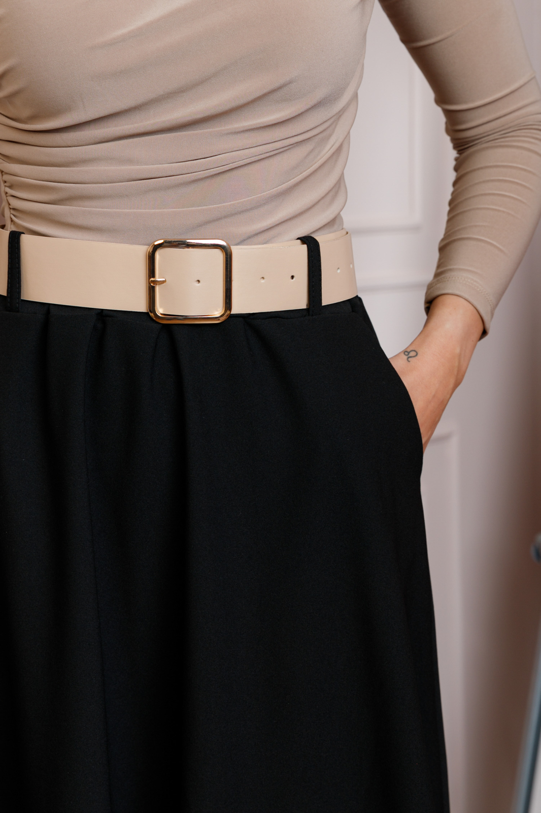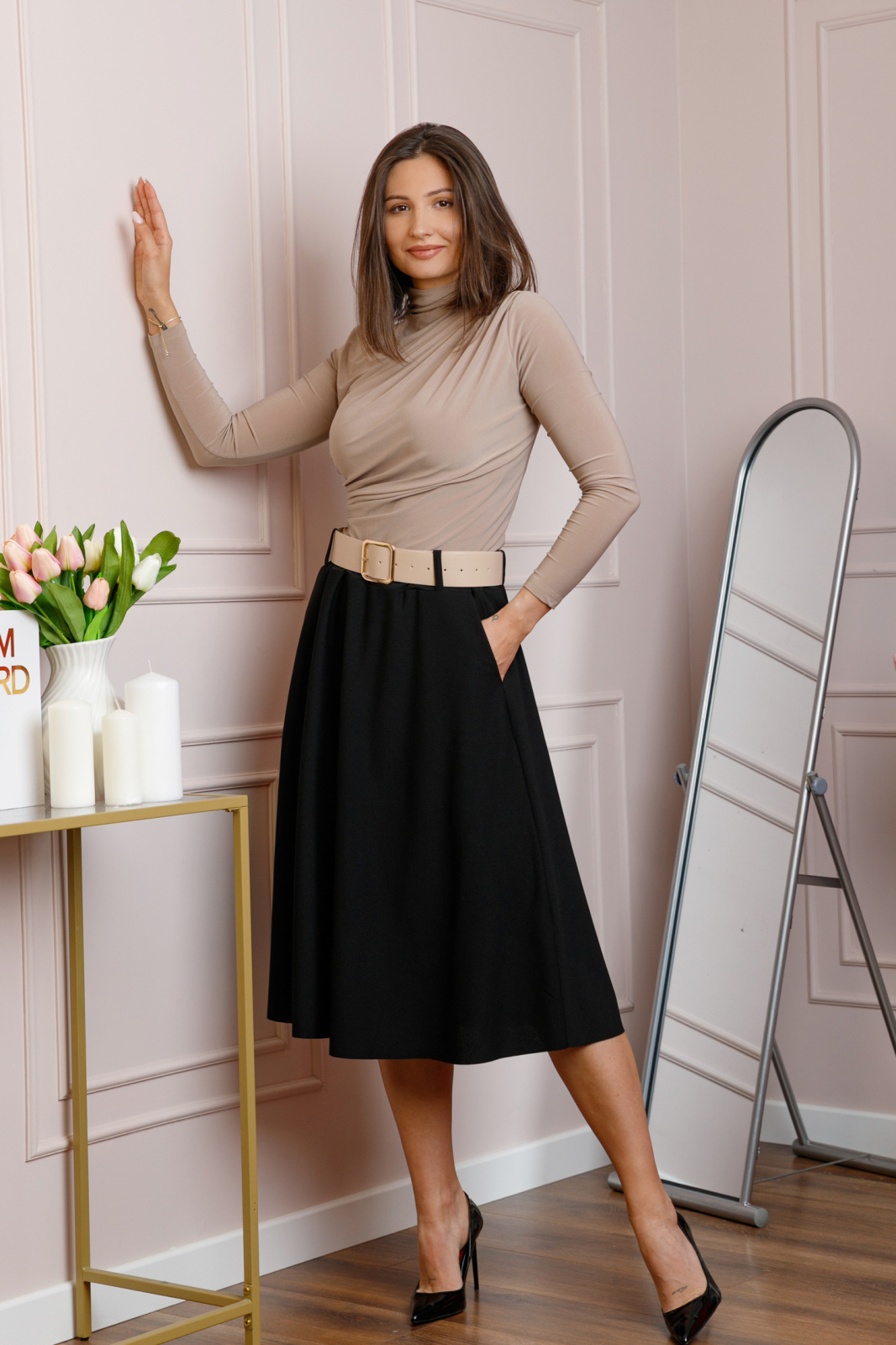 Lungimea midi ofera un echilibru perfect intre eleganta si confort, fiind potrivita atat pentru tinute office, cat si pentru aparitii casual rafinate. Materialul este suficient de dens si opac, astfel incat nu necesita captuseala, pastrand totodata o cadere fluida si placuta.
