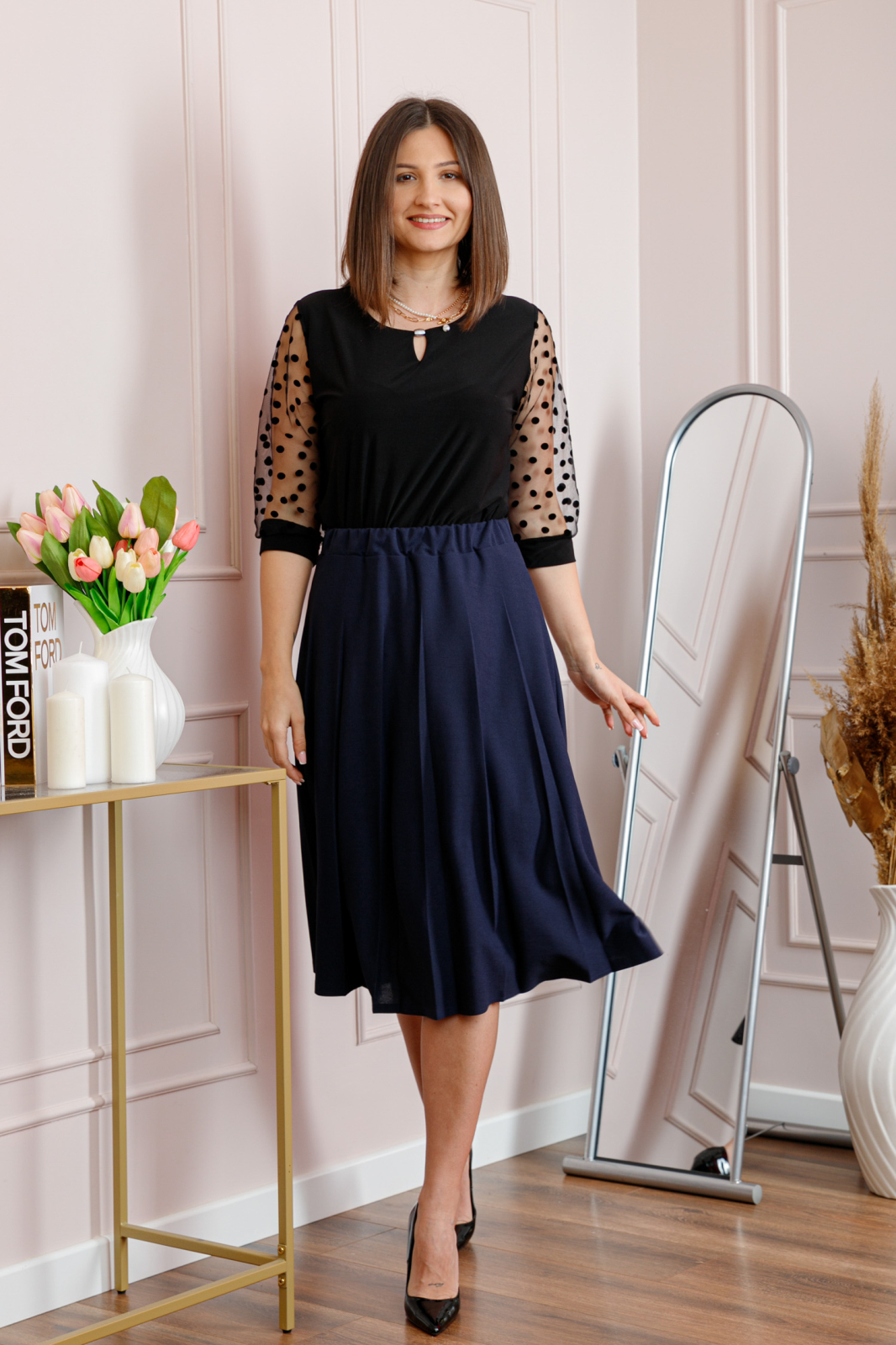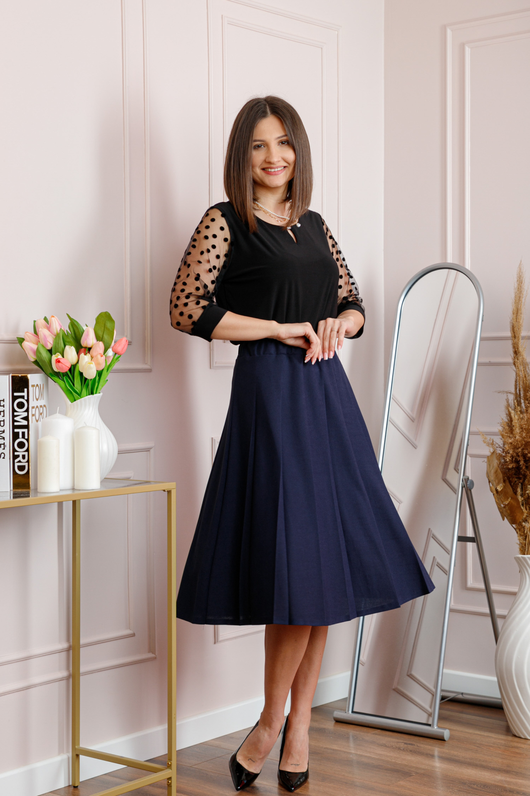 Fusta office bleumarin. Are croi plisat, pliuri largi si talie inalta. Nu se sifoneaza, nu necesita calcare.