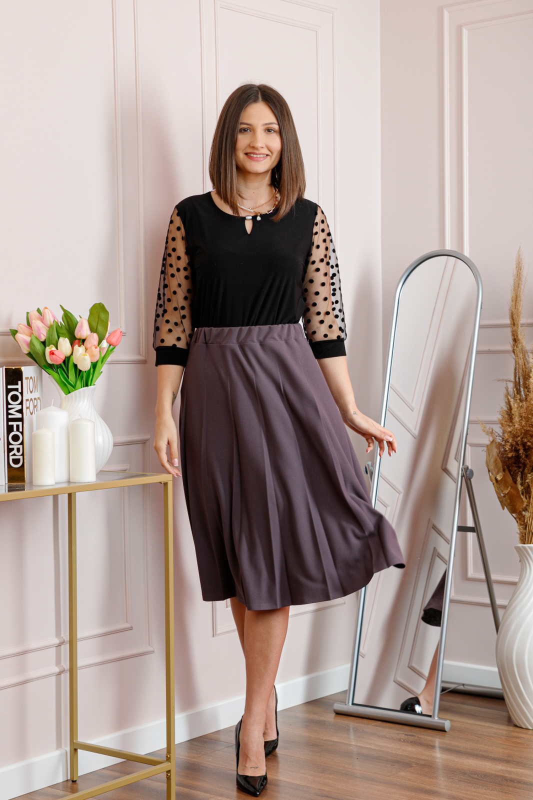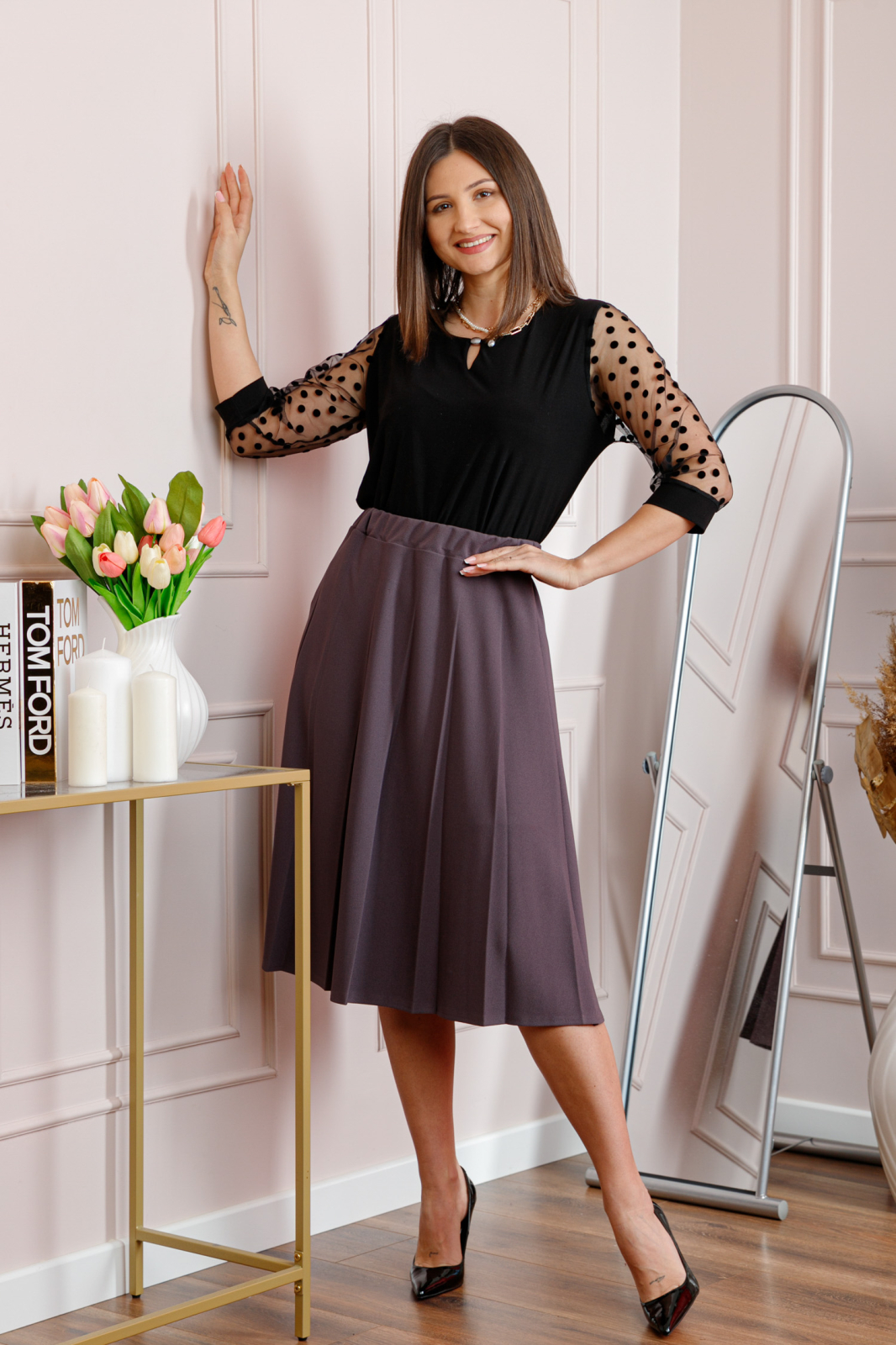 Fusta office mov lavanda. Are croi plisat, pliuri largi si talie inalta. Nu se sifoneaza, nu necesita calcare.