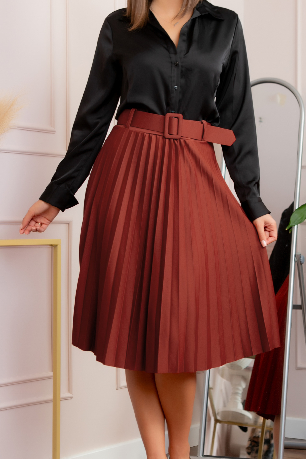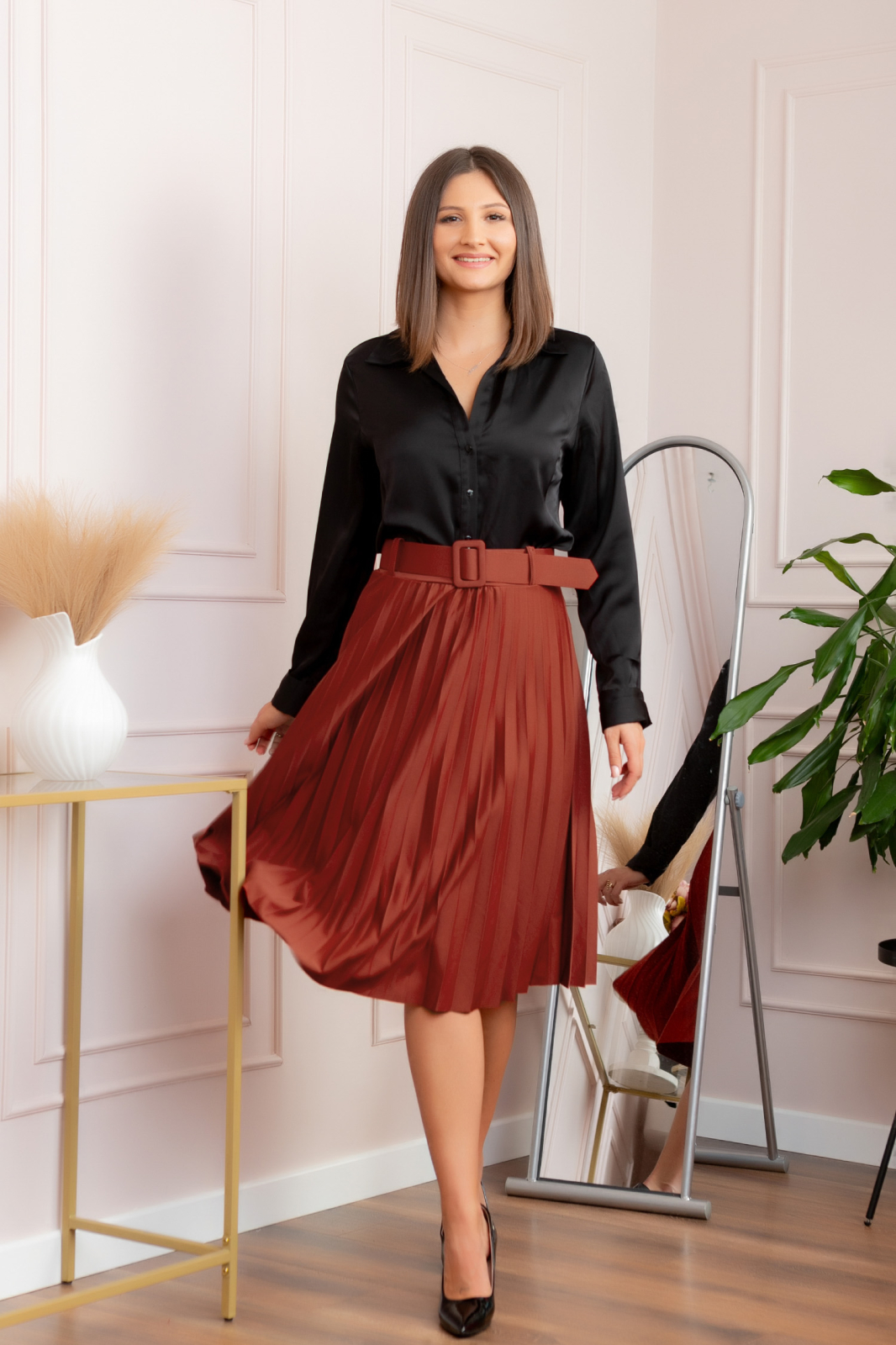 Fusta office caramizie. Are croi plisat, talie inalta si centura in talie. Betelia este elastica (76 cm - 96 cm) si se potriveste masurilor de la 40 la 46. Nu se sifoneaza, nu necesita calcare.