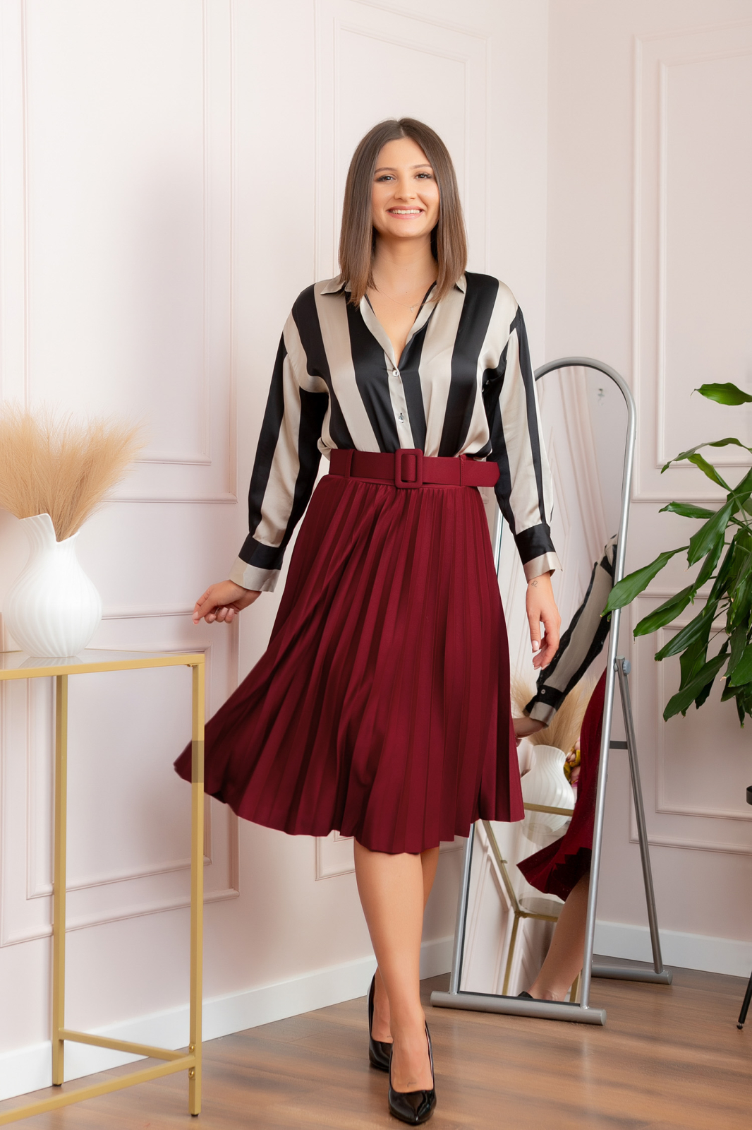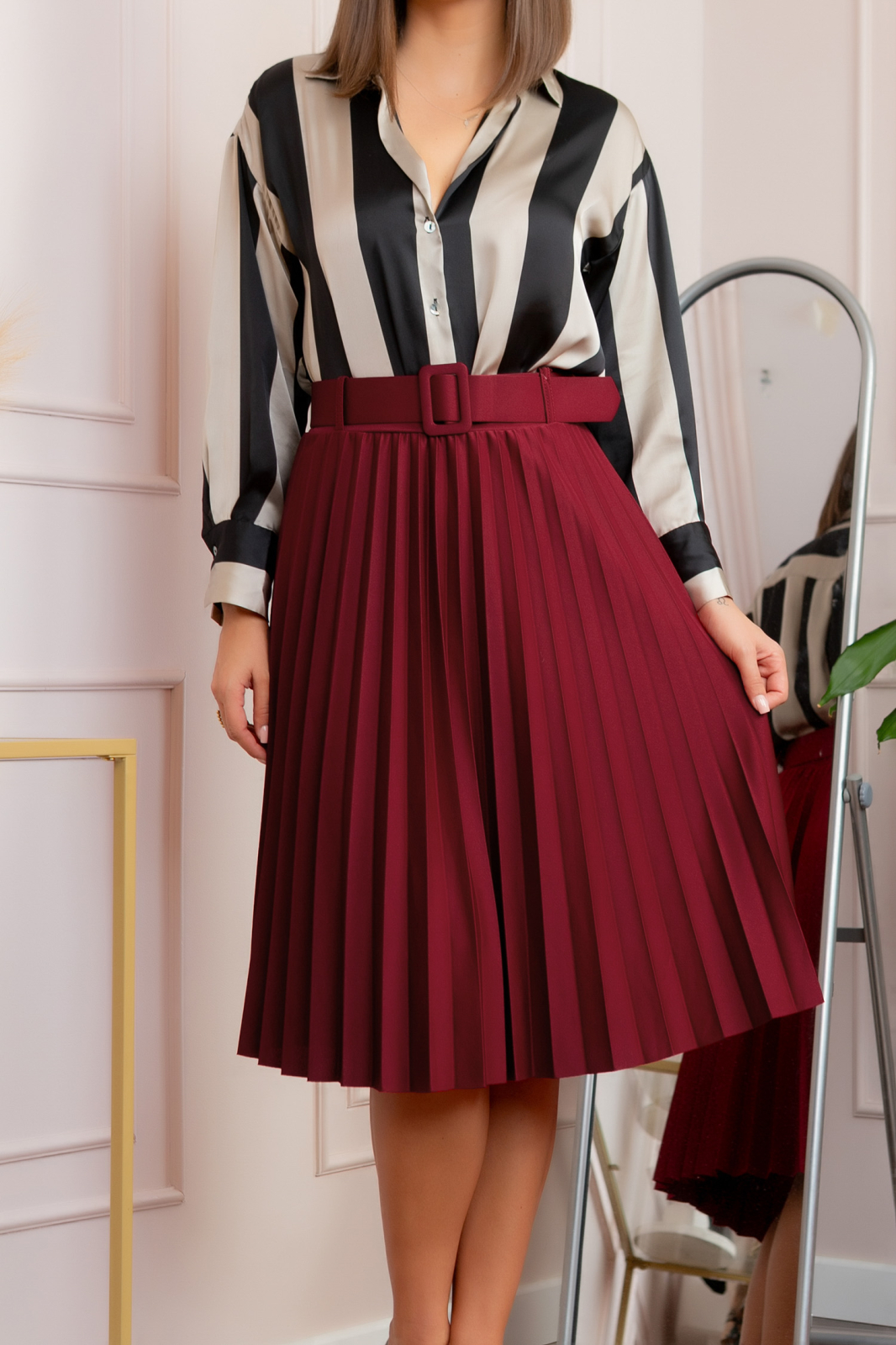 Fusta office grena. Are croi plisat, talie inalta si centura in talie. Betelia este elastica (76 cm - 96 cm) si se potriveste masurilor de la 40 la 46. Nu se sifoneaza, nu necesita calcare.