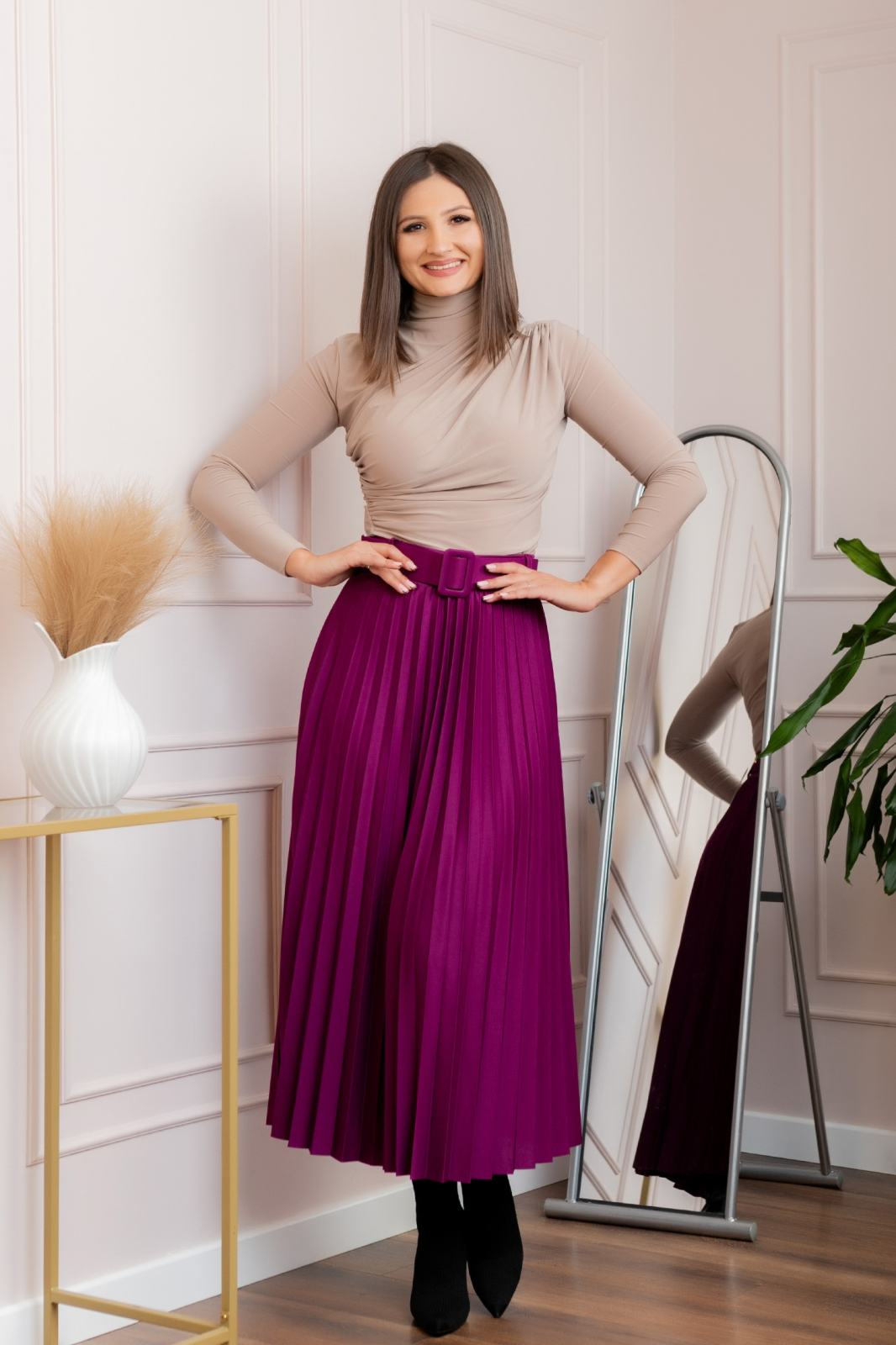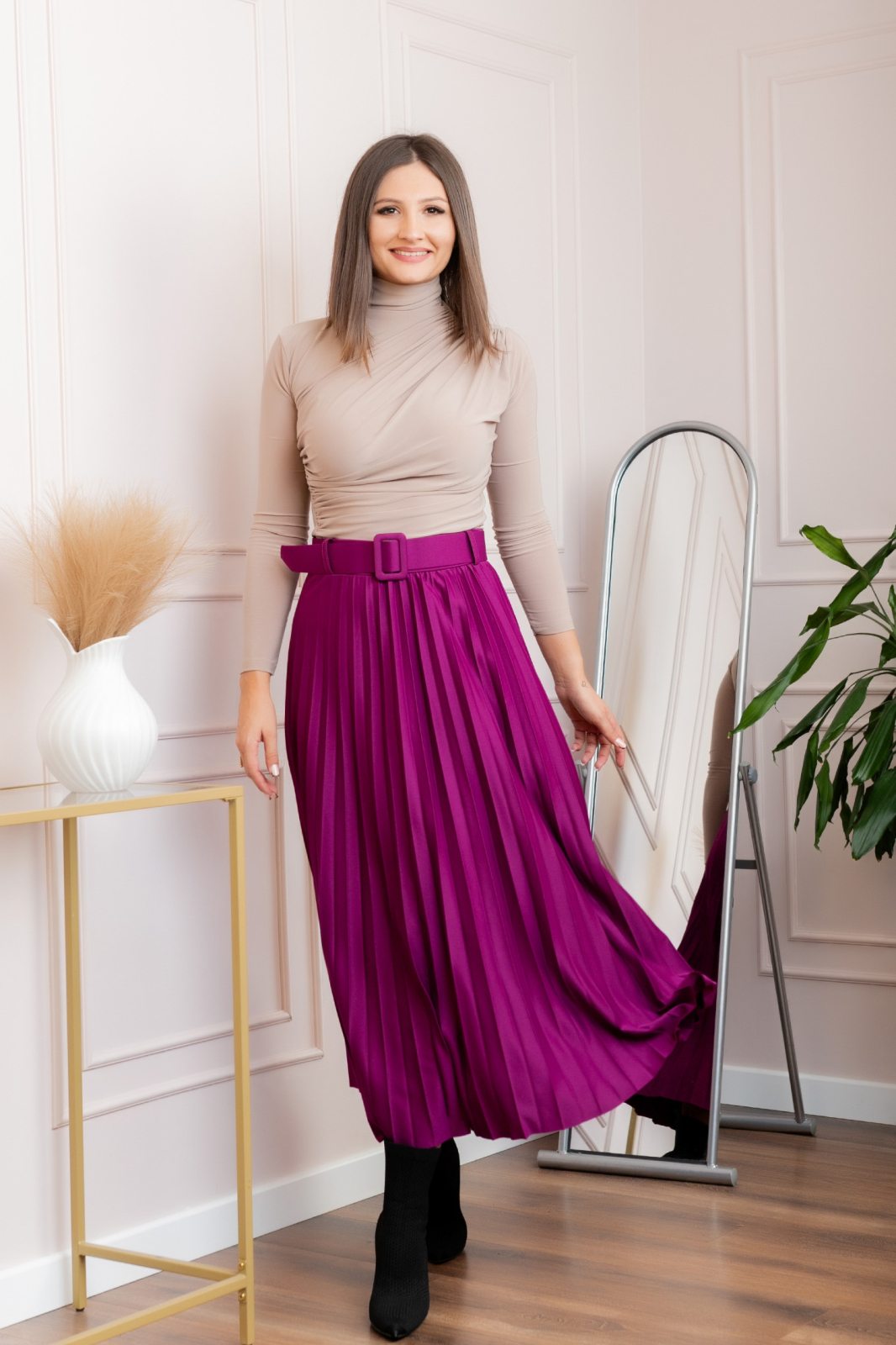 Fusta lunga plisata Nova cu centura este piesa statement care adauga eleganta si rafinament tinutelor de sezon. Croiul sau lung si fluid, completat de pliseurile verticale, ofera lejeritate in miscare si avantajeaza orice silueta, iar cureaua lata accentueaza delicat talia.