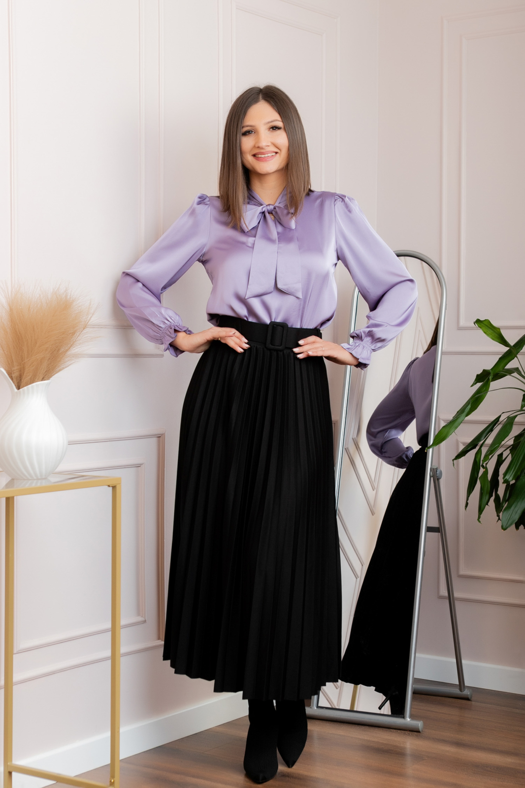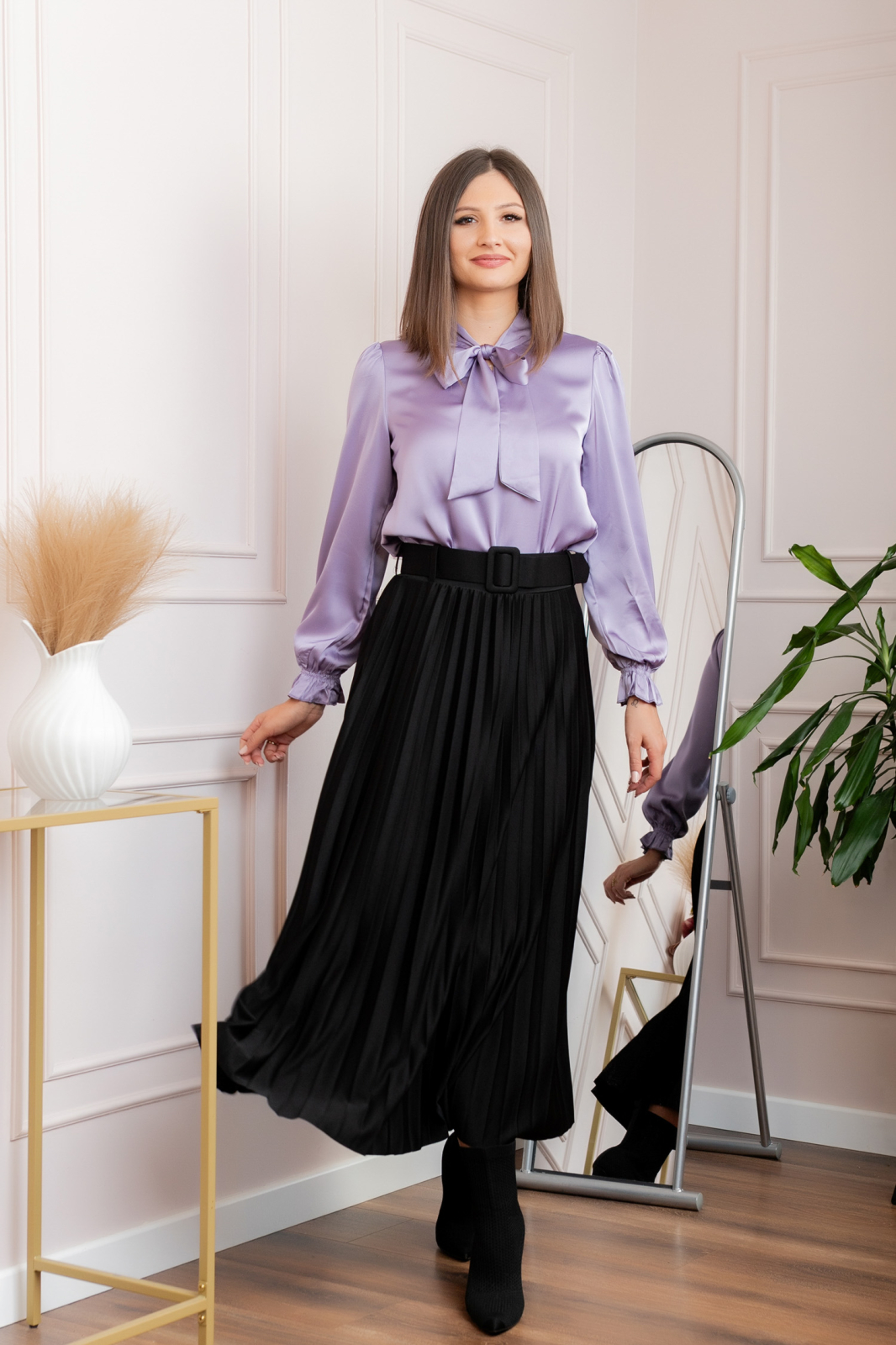 Fusta lunga plisata Nova cu centura este piesa statement care adauga eleganta si rafinament tinutelor de sezon. Croiul sau lung si fluid, completat de pliseurile verticale, ofera lejeritate in miscare si avantajeaza orice silueta, iar cureaua lata accentueaza delicat talia.