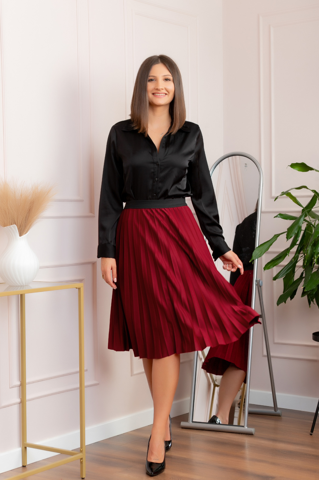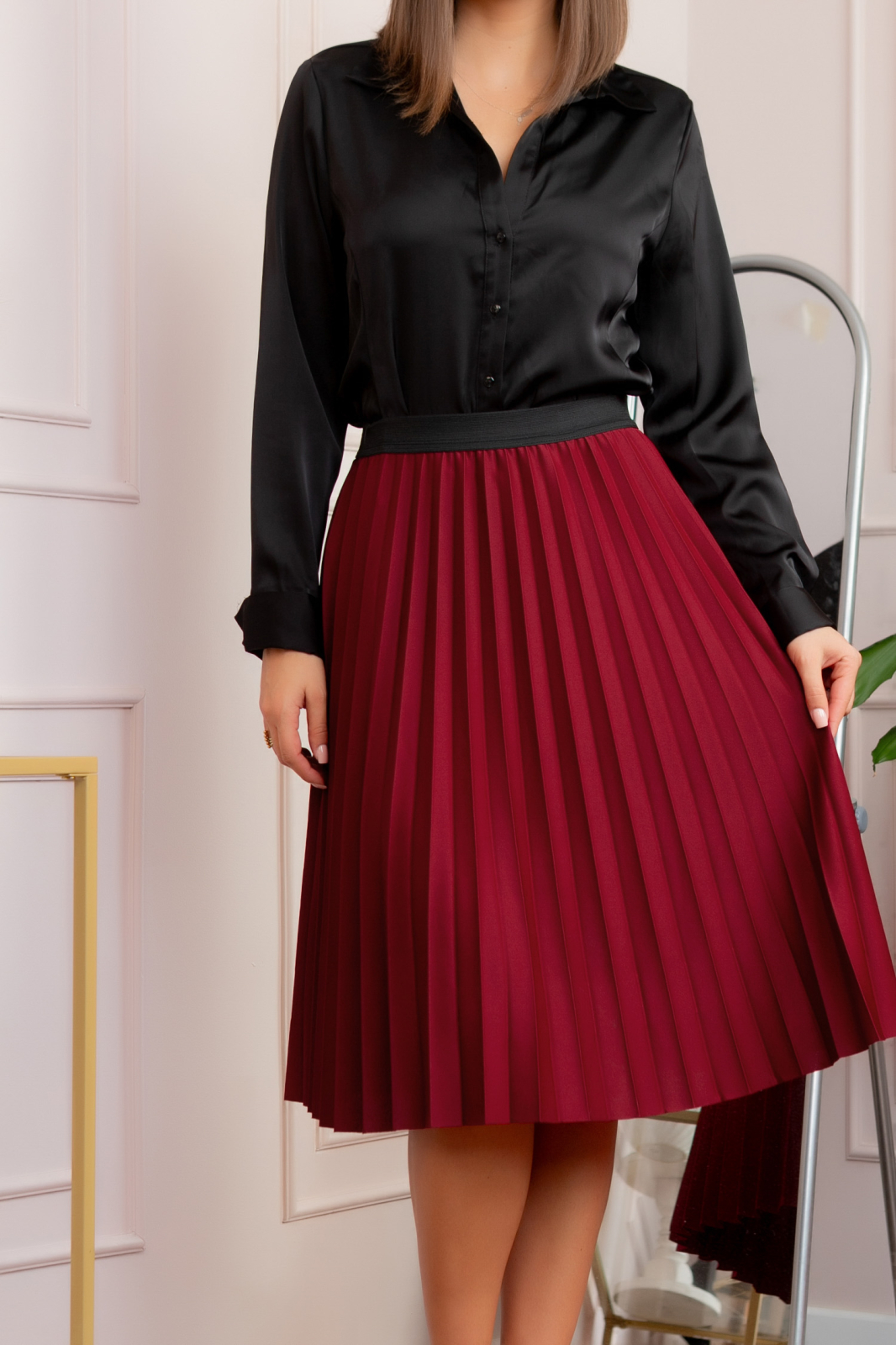 Fusta grena cu croi plisat, talie inalta si elastic in talie. Betelia este elastica si acomodeaza mai multe marimi. Nu se sifoneaza, nu necesita calcare.