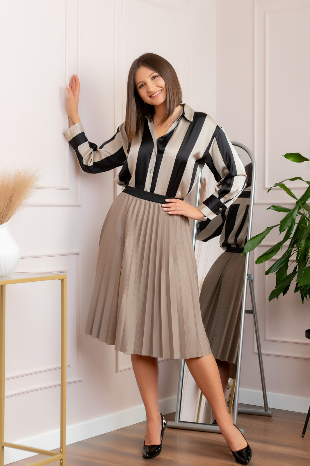 Fusta gri cu croi plisat, talie inalta si elastic in talie. Betelia este elastica si acomodeaza mai multe marimi. Nu se sifoneaza, nu necesita calcare.