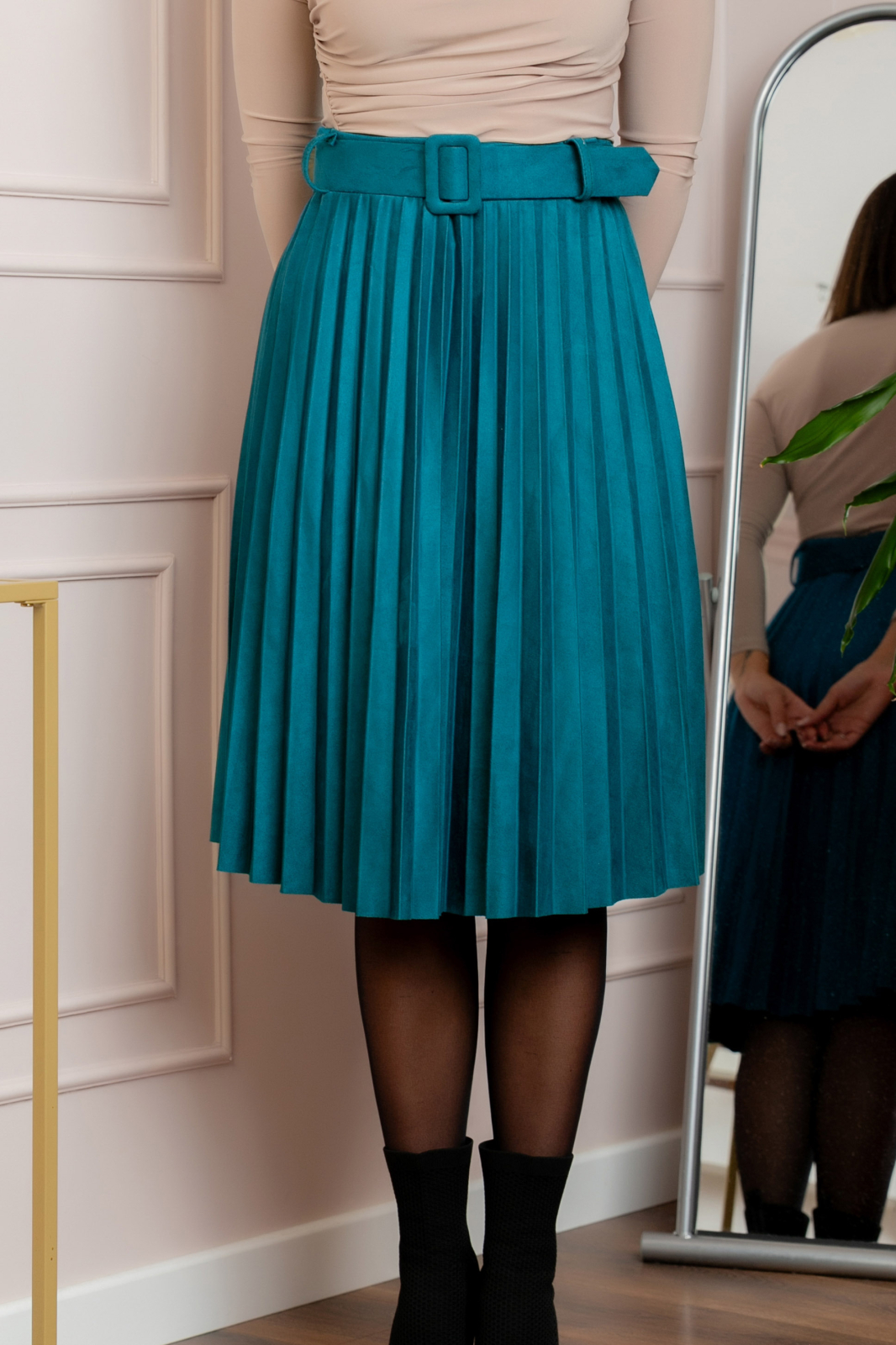 Fusta plisata Rebecca este o alegere eleganta si feminina, ideala pentru zilele racoroase in care vrei sa imbini confortul cu stilul. Croiul sau midi si textura fina din piele intoarsa ecologica ofera o tinuta moderna, potrivita atat pentru birou, cat si pentru iesiri casual.