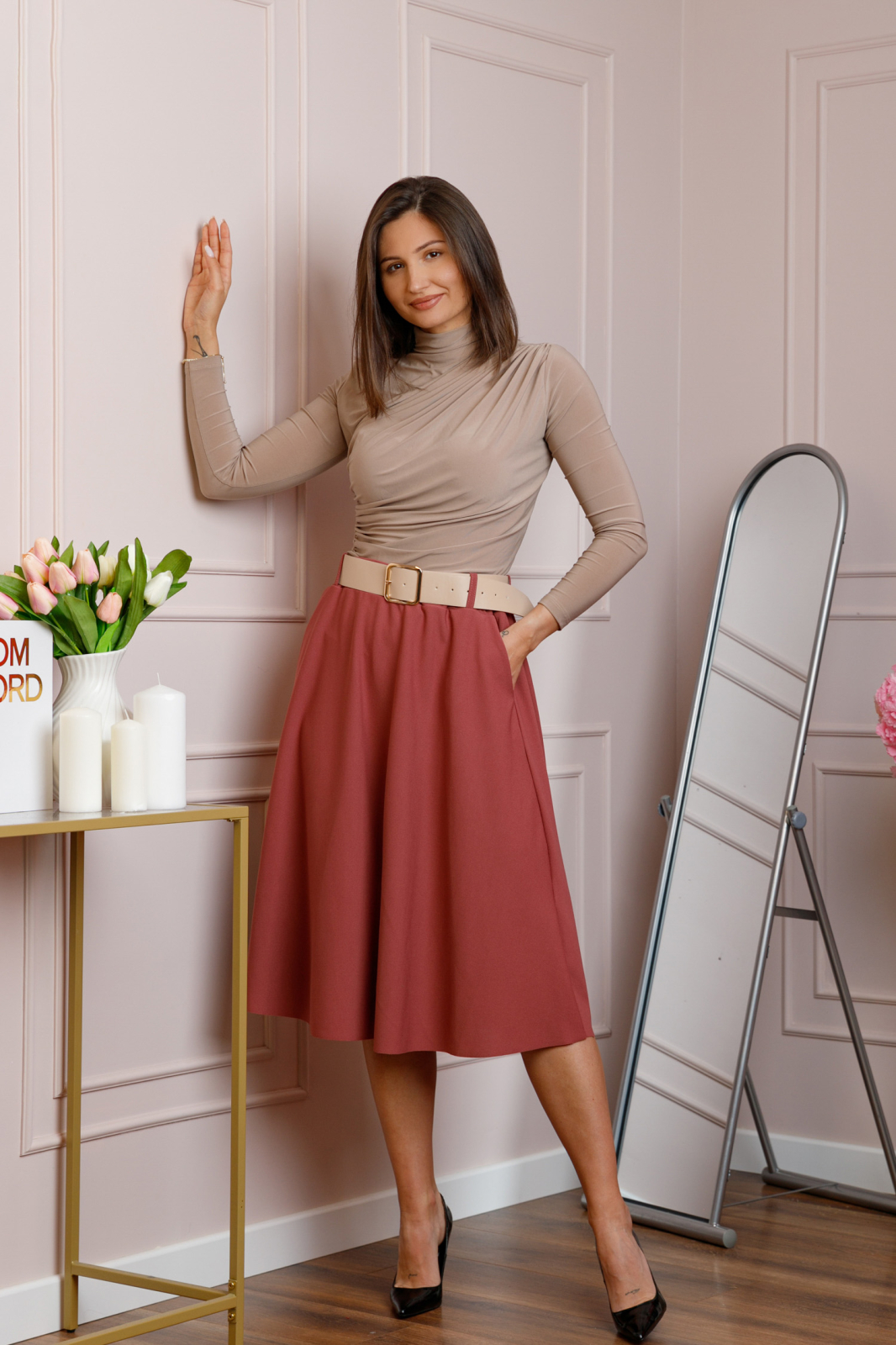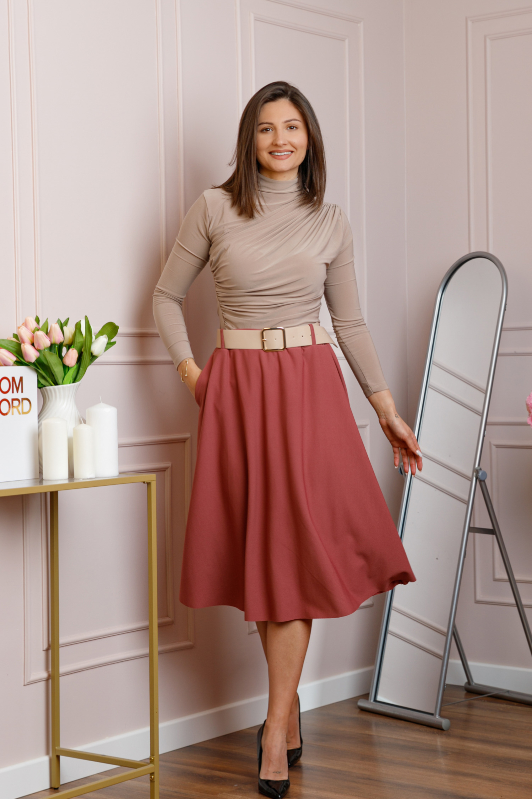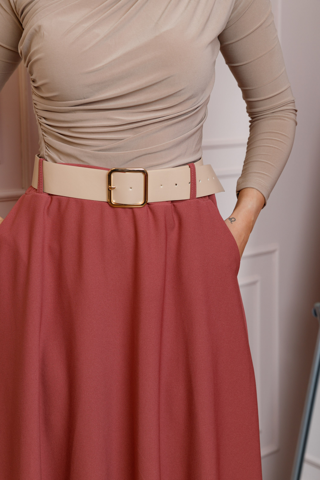 Lungimea midi ofera un echilibru perfect intre eleganta si confort, fiind potrivita atat pentru tinute office, cat si pentru aparitii casual rafinate. Materialul este suficient de dens si opac, astfel incat nu necesita captuseala, pastrand totodata o cadere fluida si placuta.