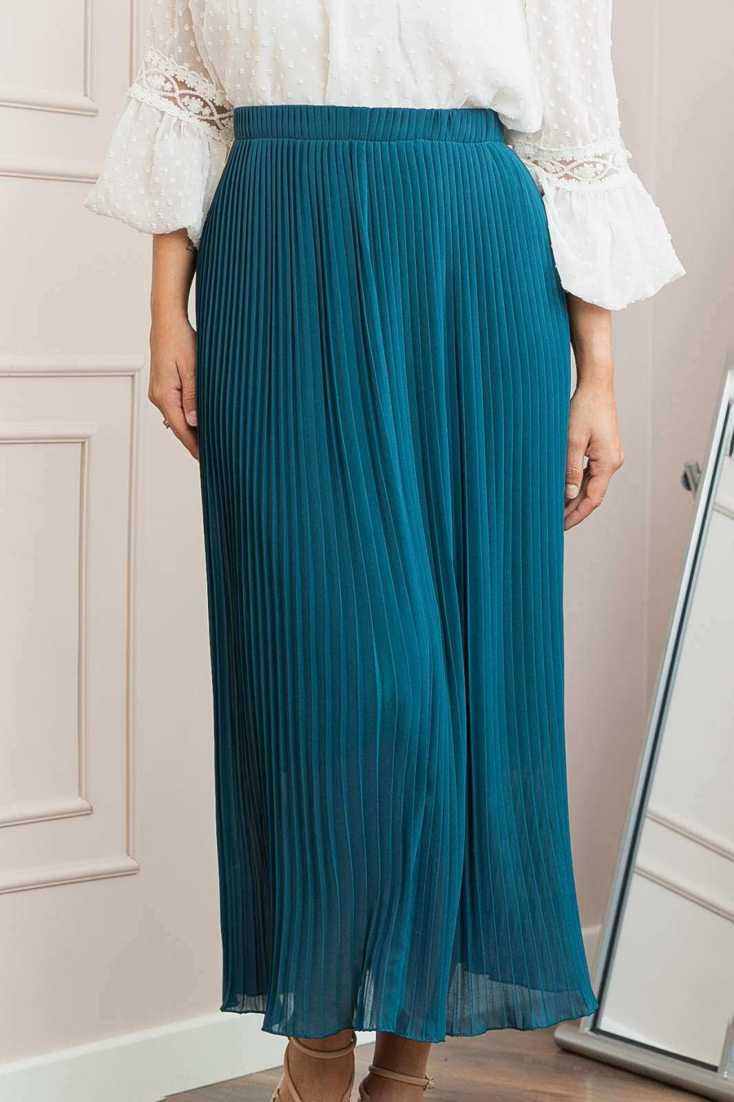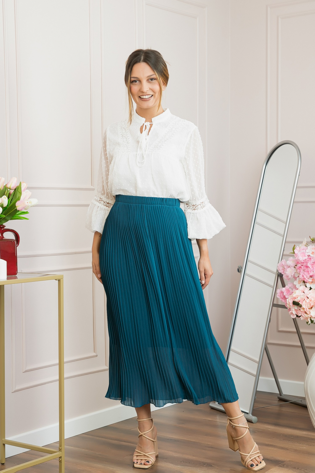 Aceasta fusta midi plisata in nuanta turcoaz inchis este piesa de rezistenta pentru orice garderoba. Confectionata dintr-un material vaporos si usor, fusta are un elastic confortabil in talie care asigura o potrivire perfecta si un look elegant. La interior este prevazuta cu jupa.