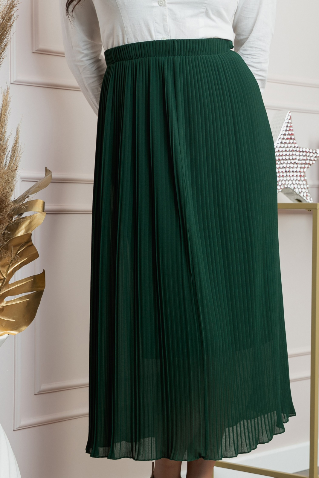 Fusta midi plisata verde cu elastic in talie.