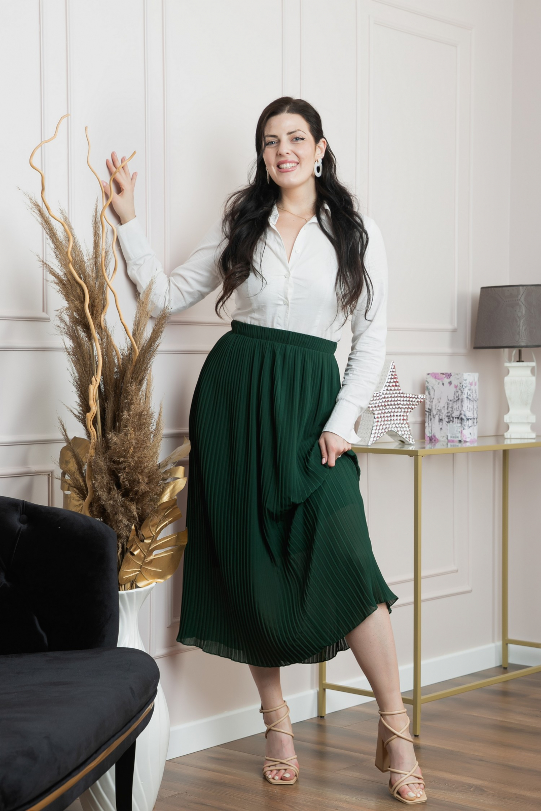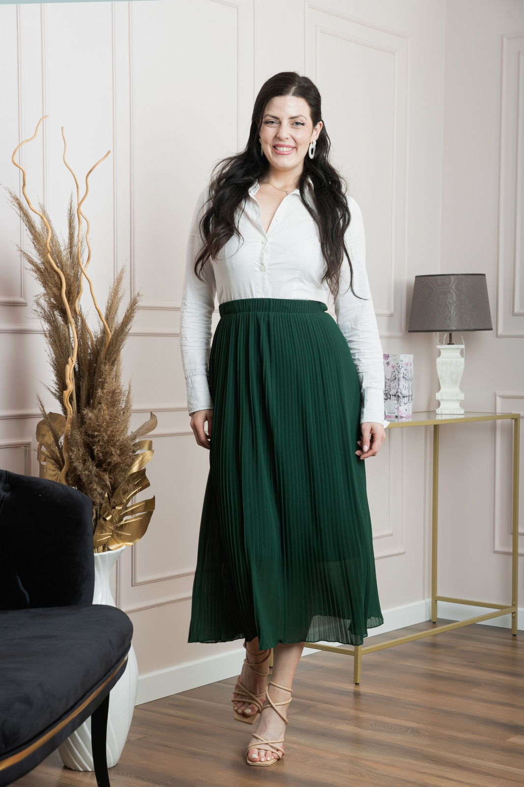 Aceasta fusta midi plisata in nuanta verde este piesa de rezistenta pentru orice garderoba. Confectionata dintr-un material vaporos si usor, fusta are un elastic confortabil in talie care asigura o potrivire perfecta si un look elegant. La interior este prevazuta cu jupa.