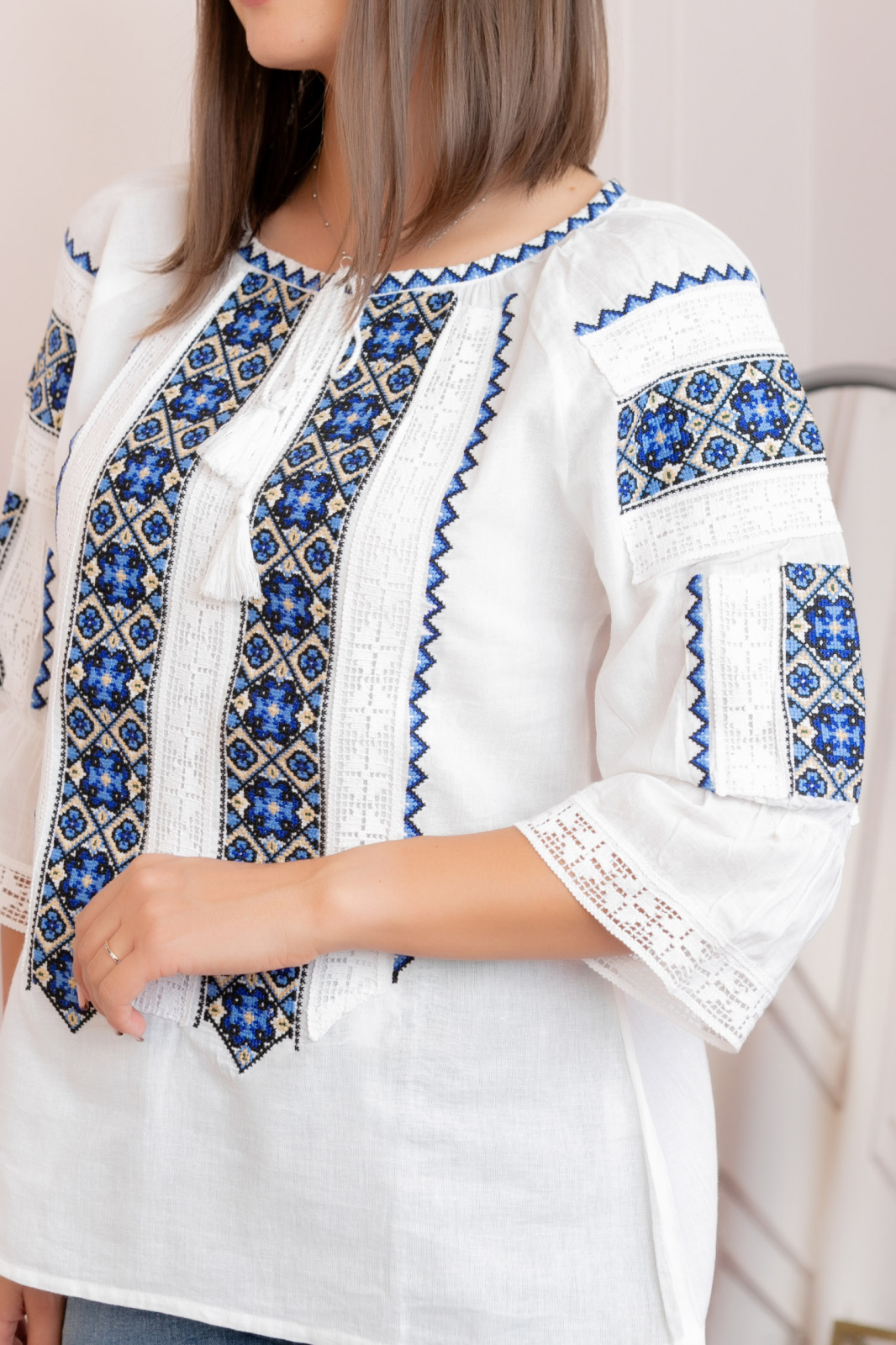 Bluza tip ie din bumbac alb, decorata cu broderie albastra cu motive geometrice pe piept si maneci. Croiala lejera si manecile clopot confera un plus de feminitate si libertate de miscare. Este o alegere versatila, ideala atat pentru tinute casual de zi, cat si pentru combinatii elegante.