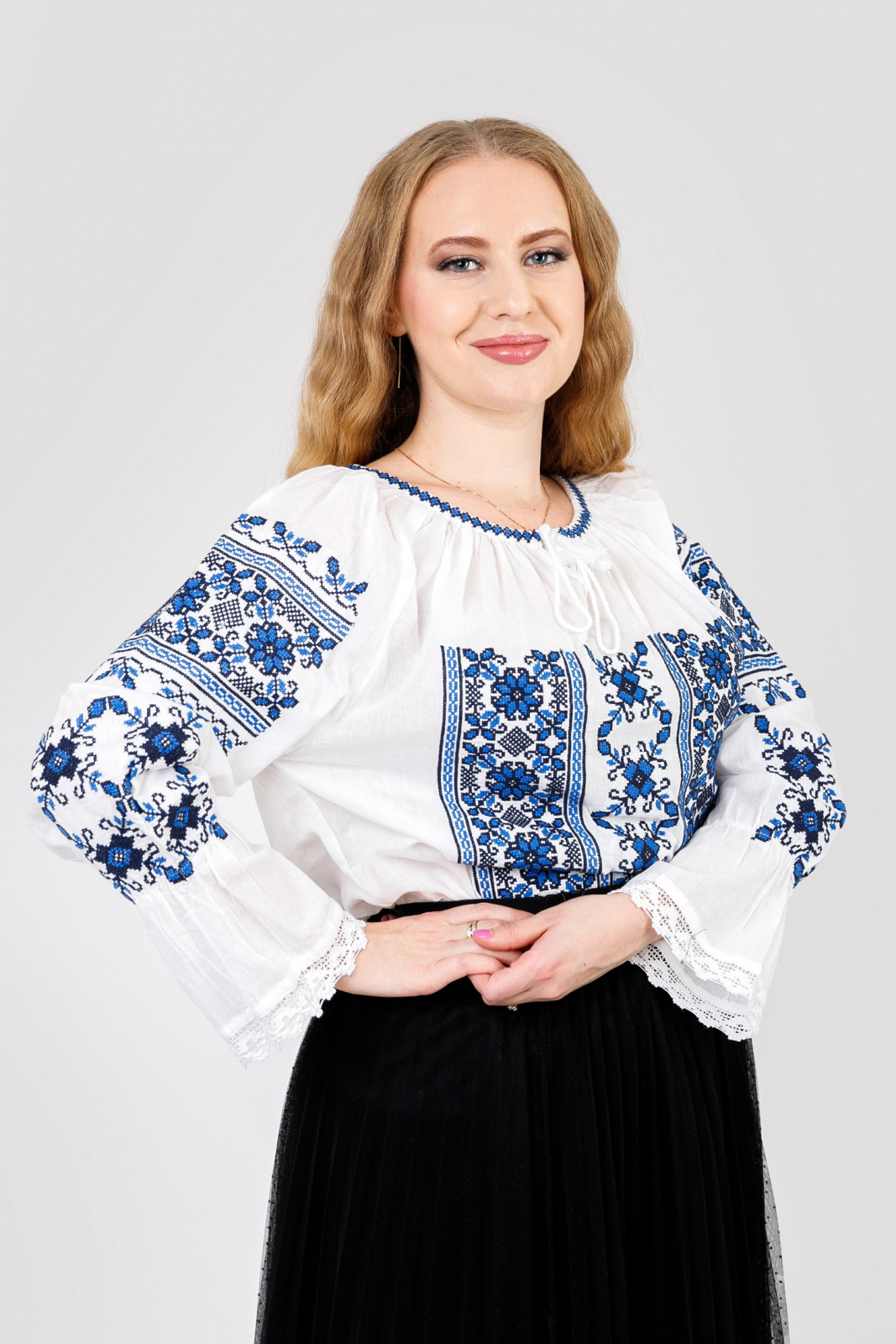 Ie traditionala alba cu motiv floral albastru Liana 05