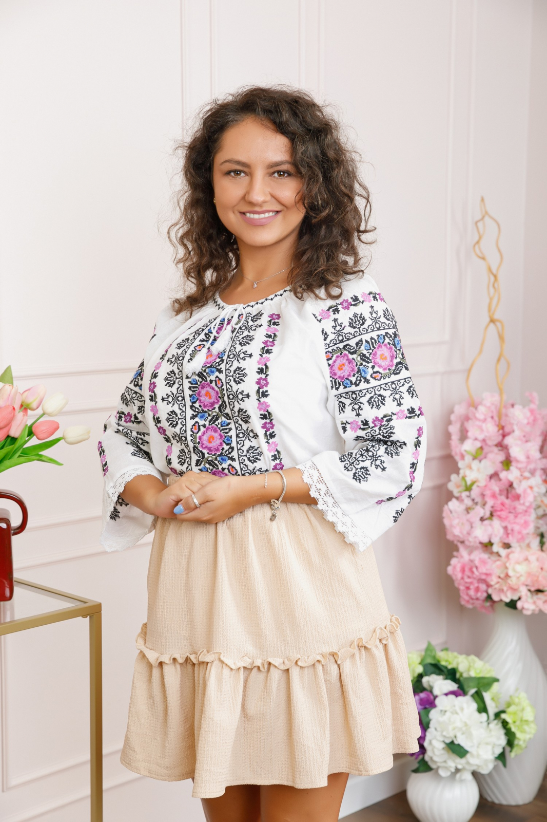 Ie traditionala alba cu motiv floral mov Adriela 01