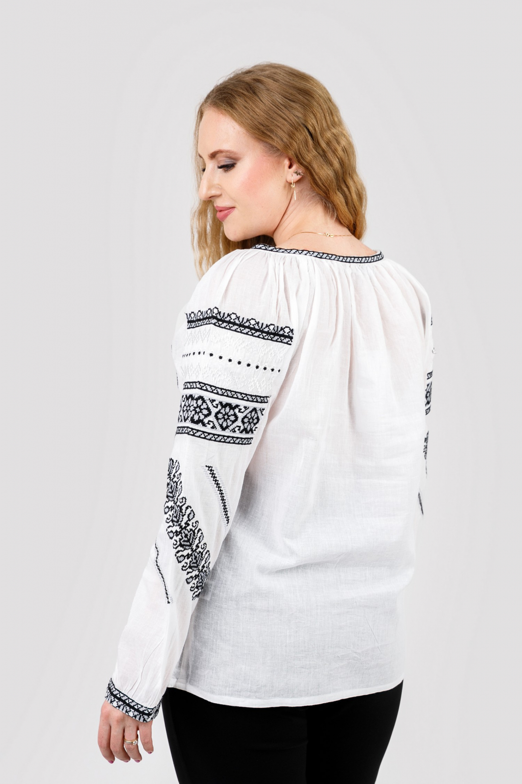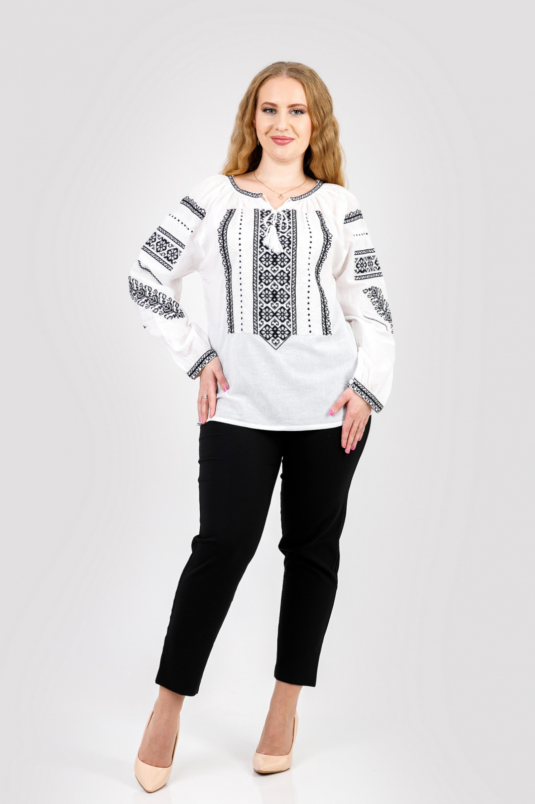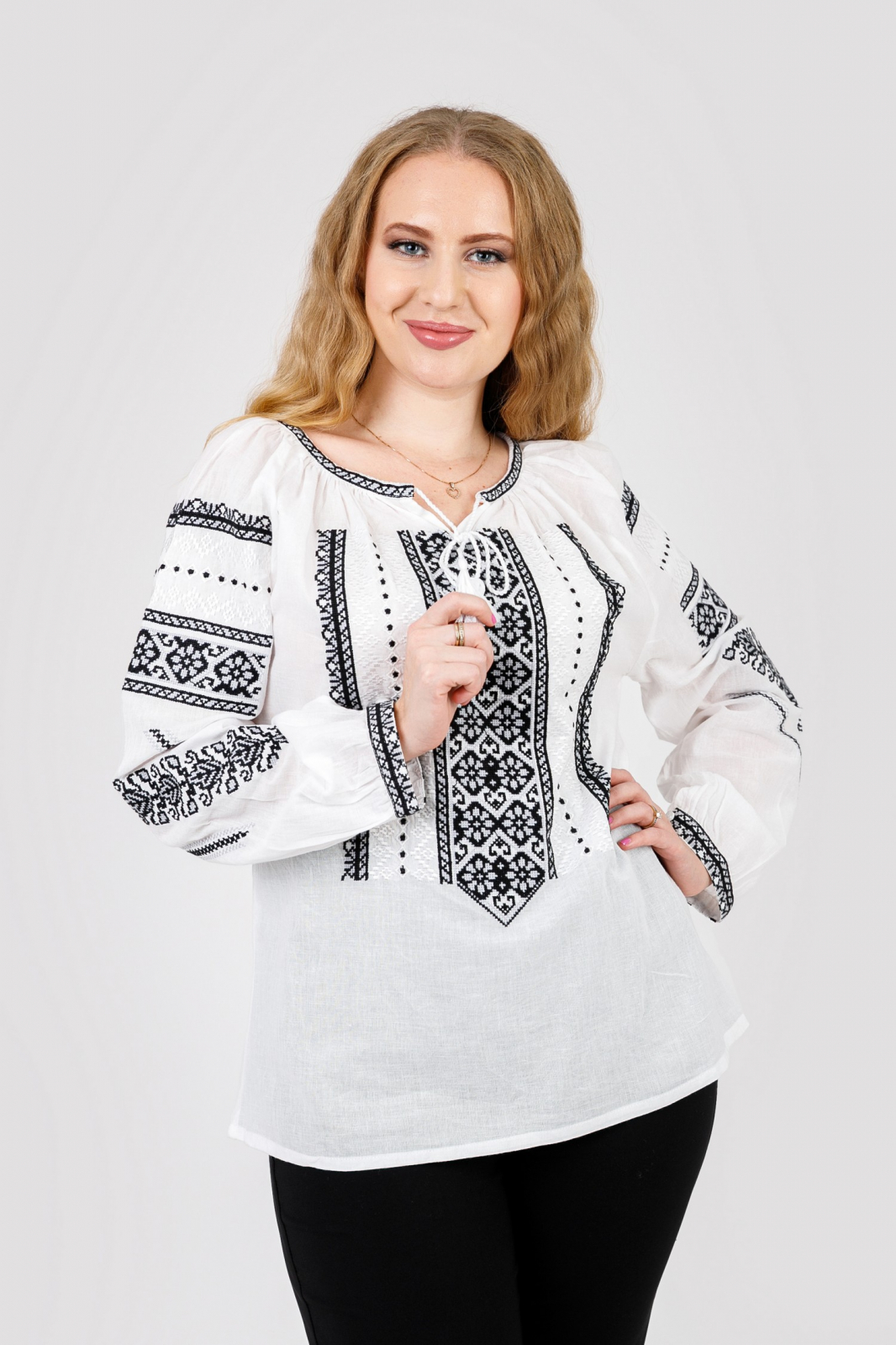 Ie traditionala alba din bumbac cu maneca lunga si motiv traditional negru.