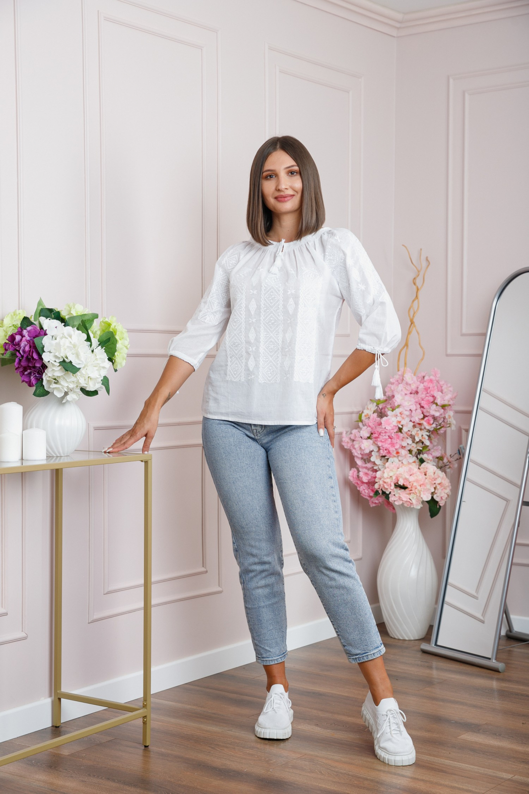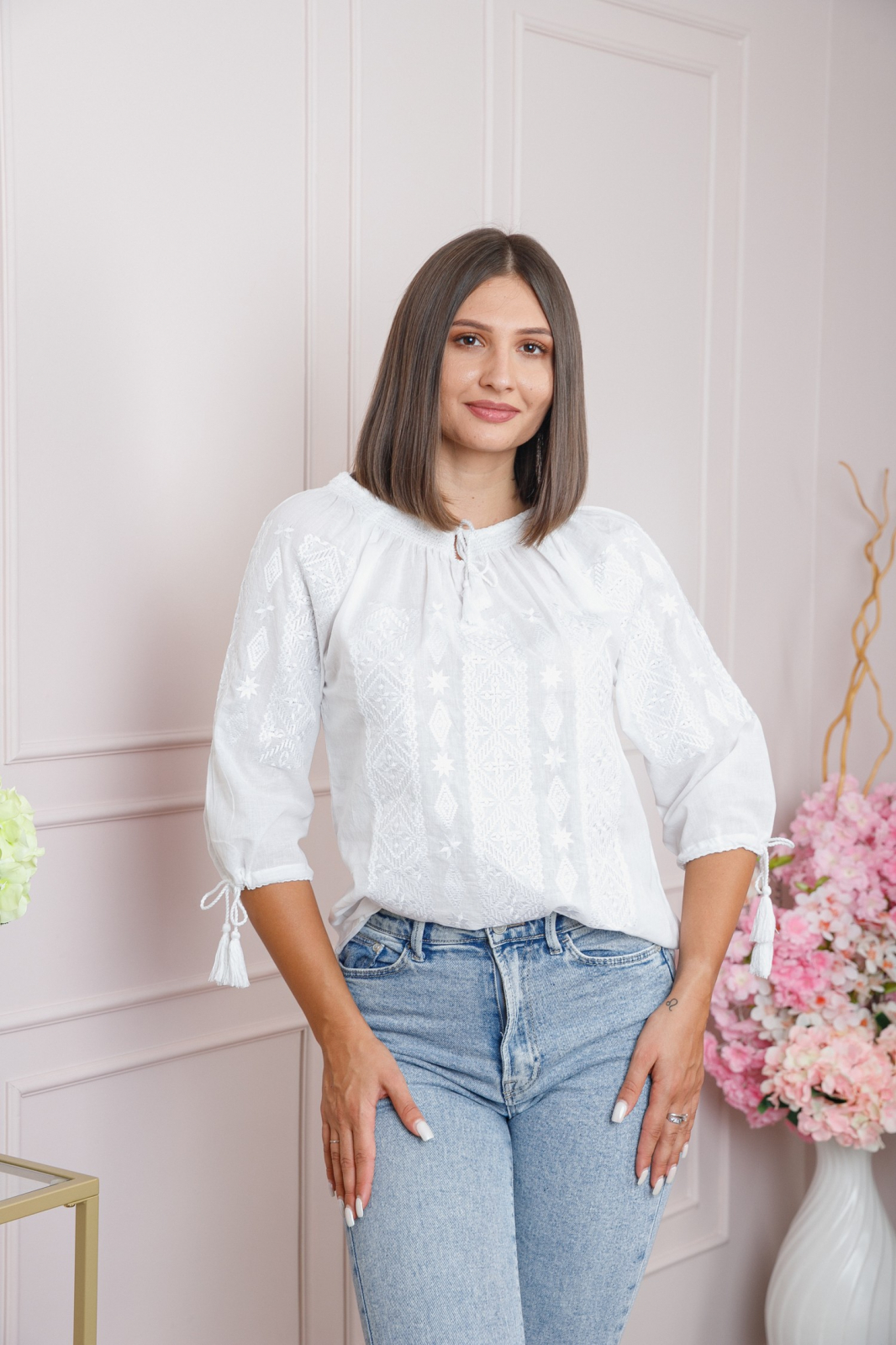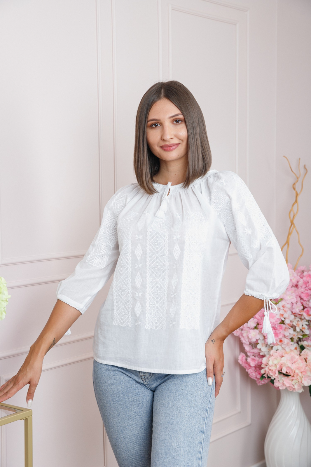 Ie traditionala alba din bumbac cu maneca 3/4 si motiv traditional alb.