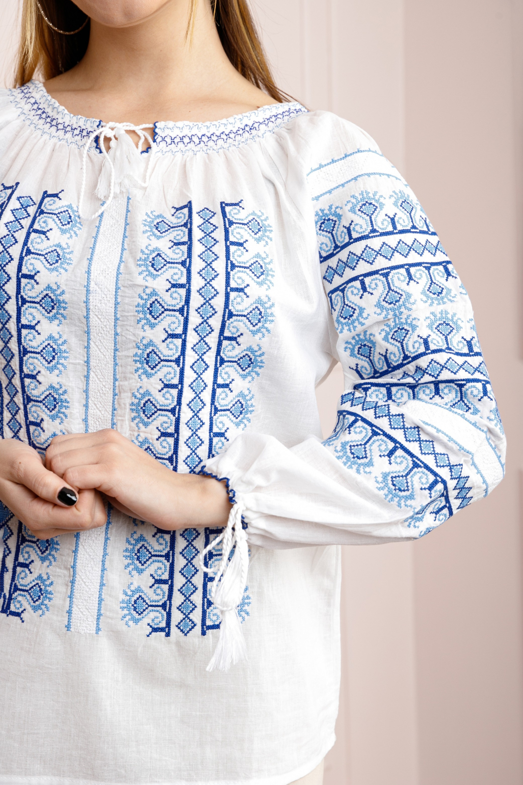 Ie traditionala alba cu motiv geometric albastru Vera 05