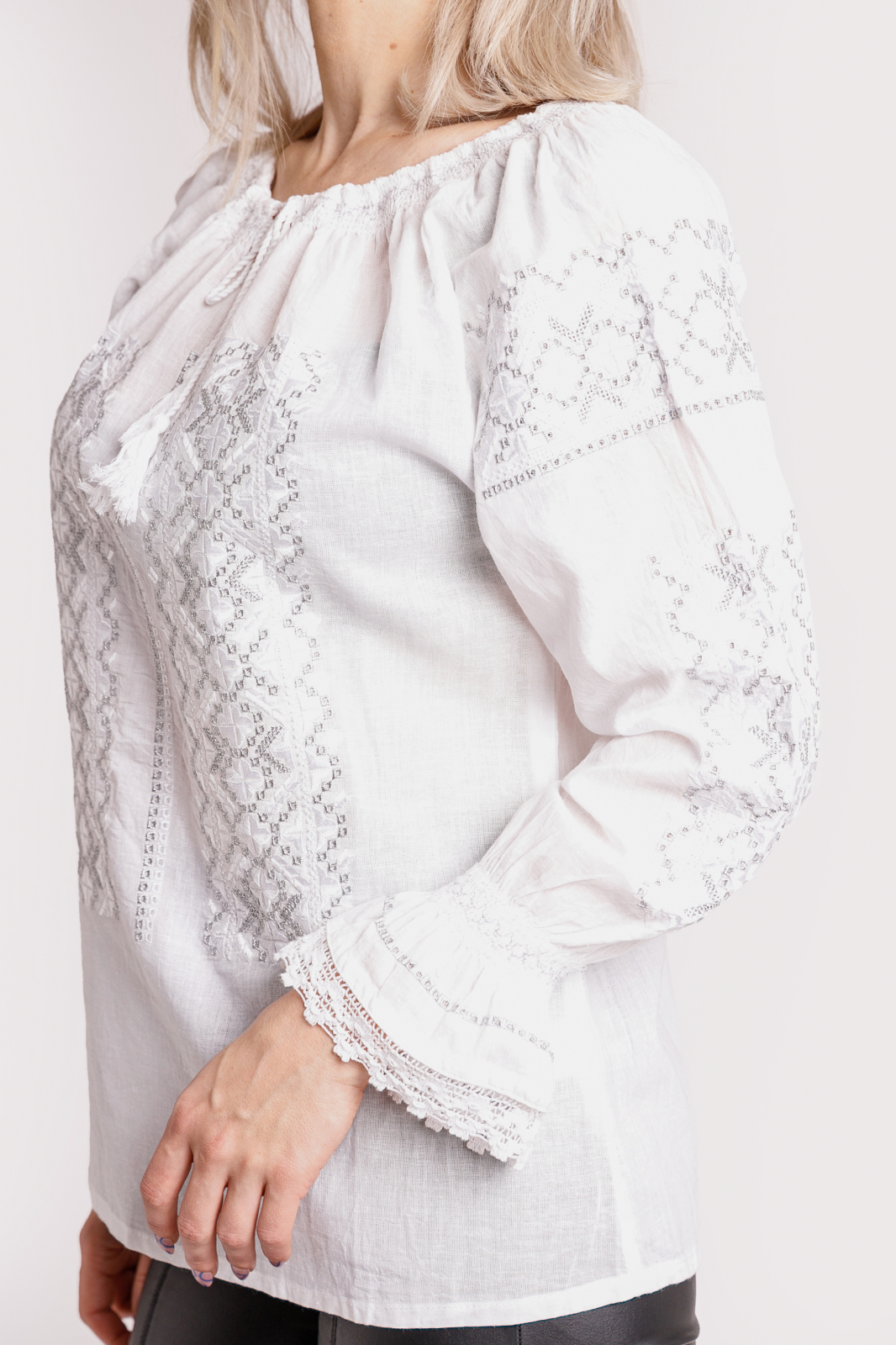 Ie traditionala alba cu motiv geometric argintiu Celia 02
