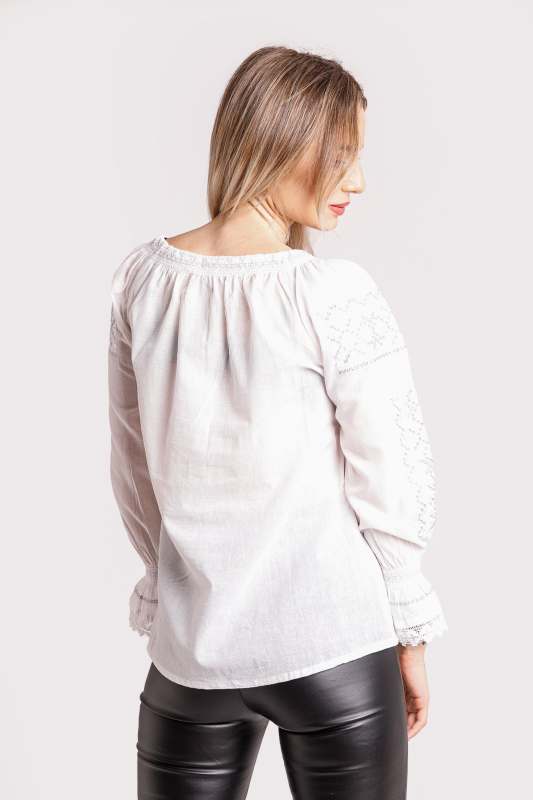 Ie traditionala alba din bumbac cu maneca lunga clopot si motiv traditional argintiu