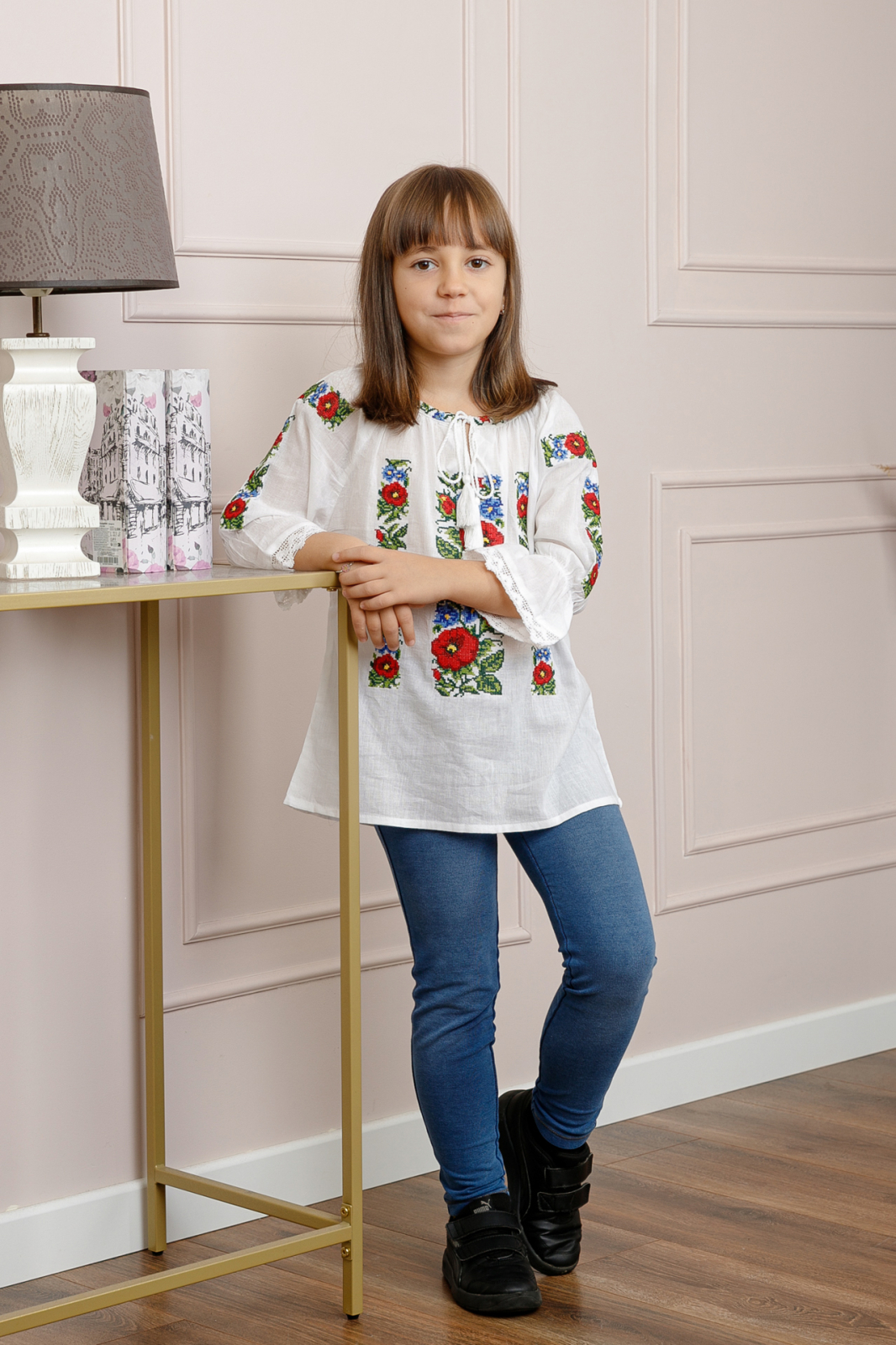 Ie traditionala alba pentru fetite cu motiv floral rosu Casandra
