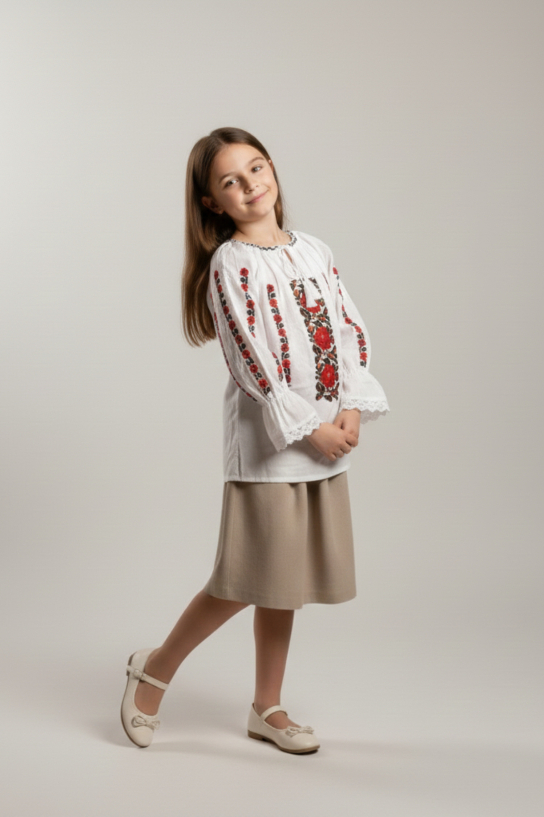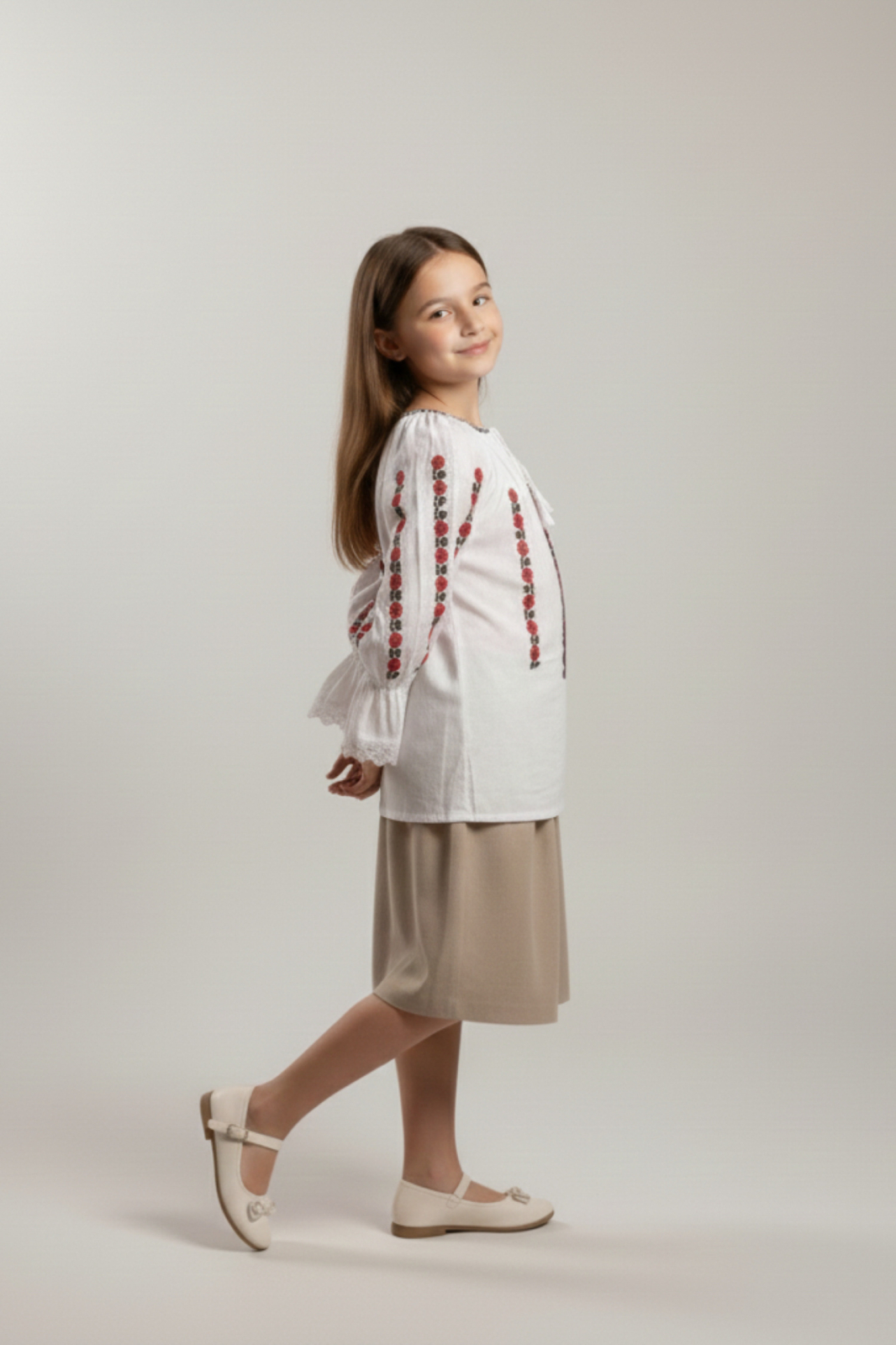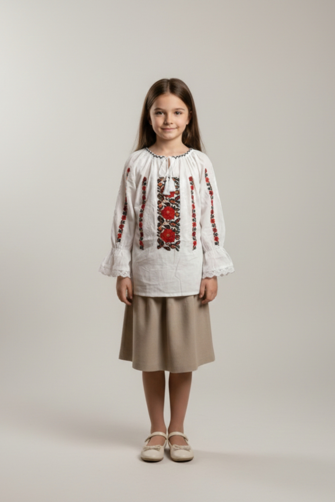 Ie pentru fetite din bumbac alb, cu broderie rosie realizata la masina, prevazuta cu maneca trei sferturi clopot. Gulerul se ajusteaza cu snur, iar materialul lasa pielea sa respire, asigurand confort pe durata intregii zile. Ideala pentru serbari scolare, evenimente tematice sau dansuri populare.
