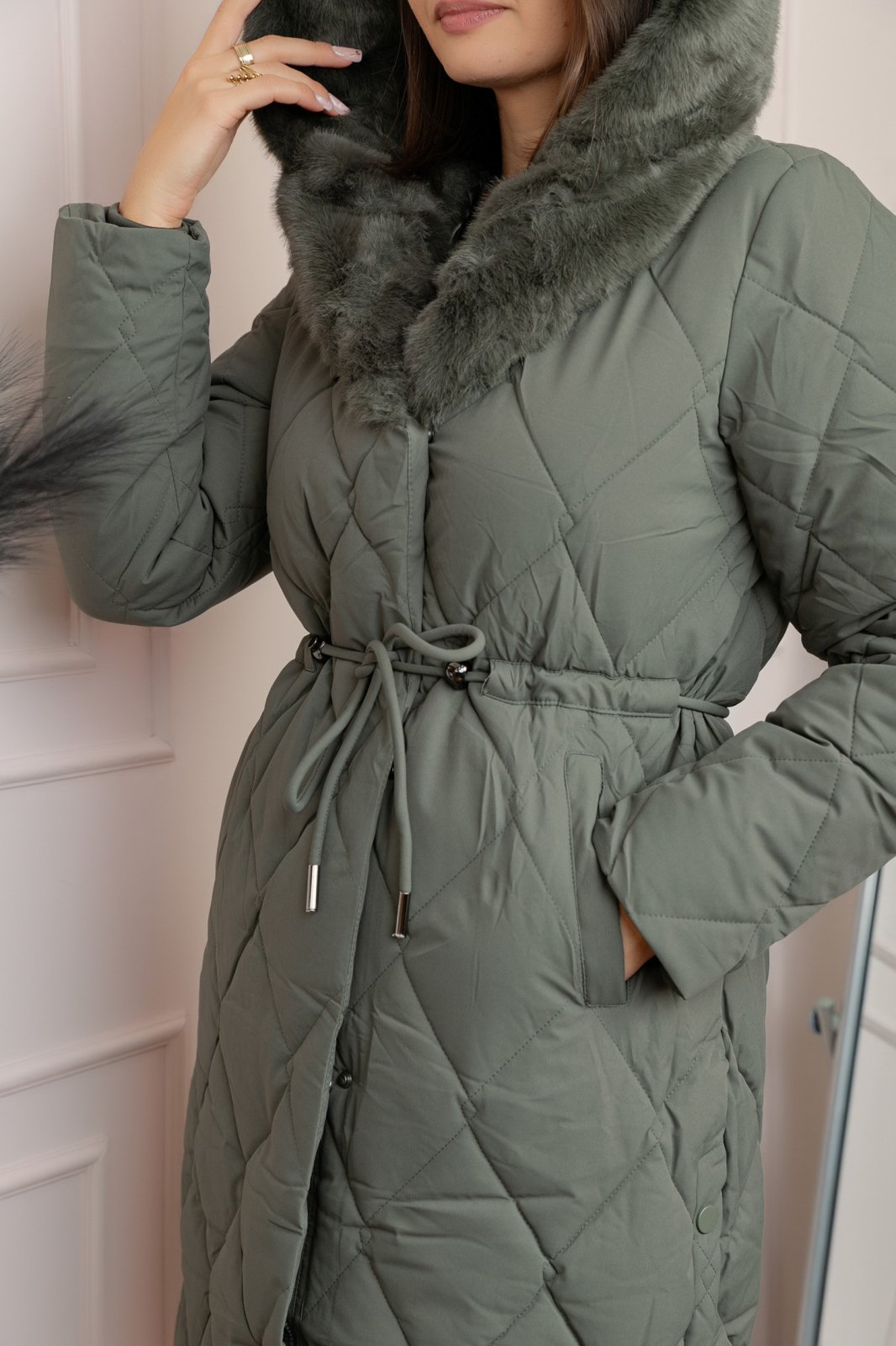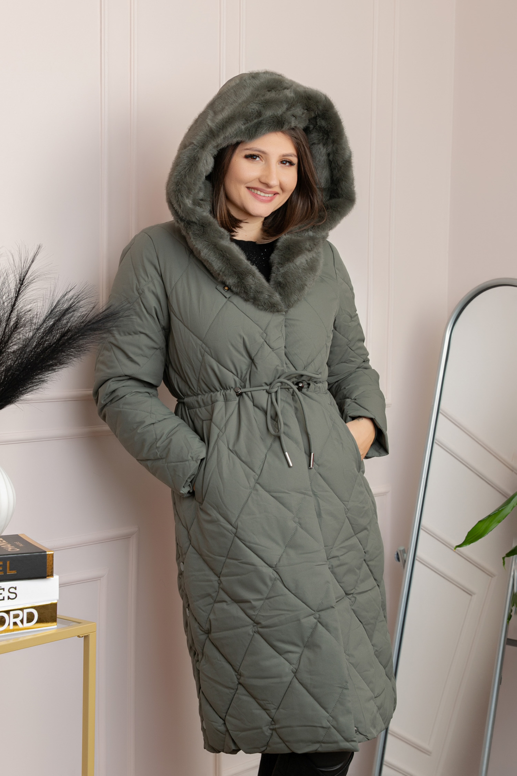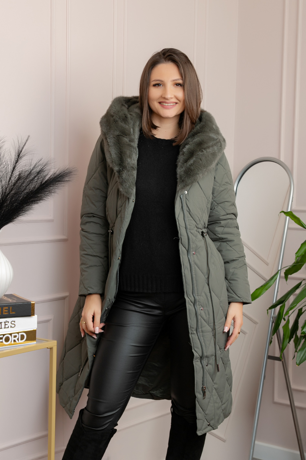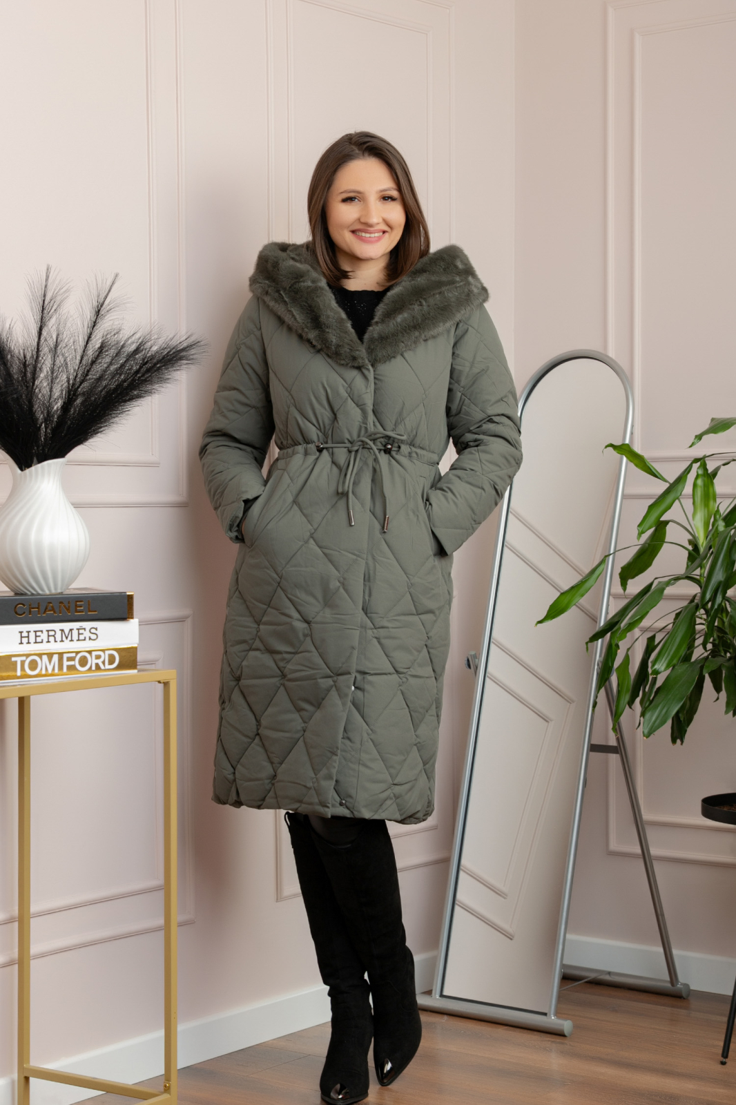 Geaca Kimberly este alegerea ideala pentru un look elegant si calduros in sezonul rece. Realizata din fas matlasat, aceasta geaca lunga imbina perfect eleganta cu functionalitatea. Gluga ampla, imblanita si nedetasabila, ofera protectie impotriva frigului, iar snurul reglabil din talie evidentiaza frumos silueta. Inchiderea cu fermoar si capse ascunse, precum si buzunarele laterale functionale, adauga un plus de confort si stil.