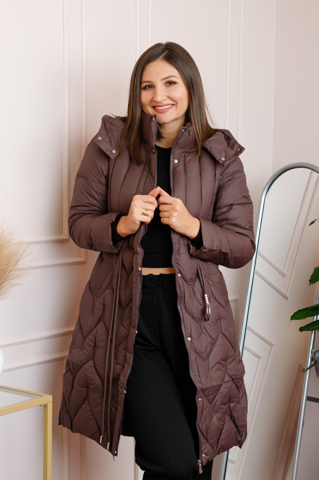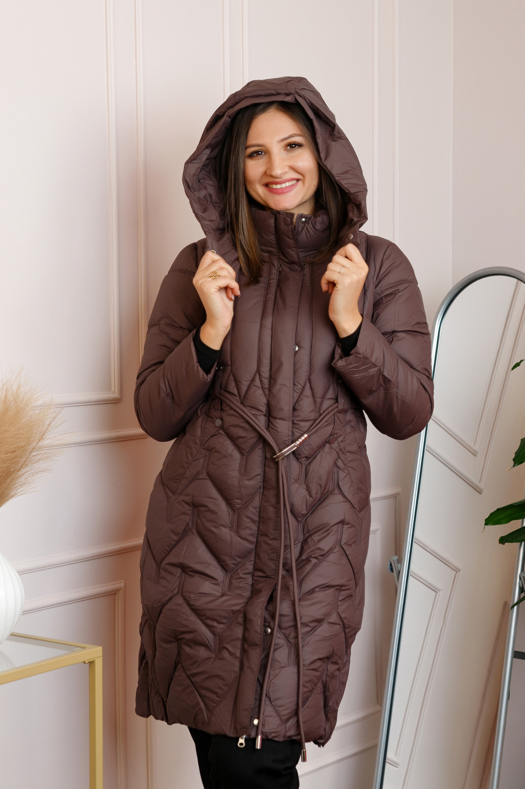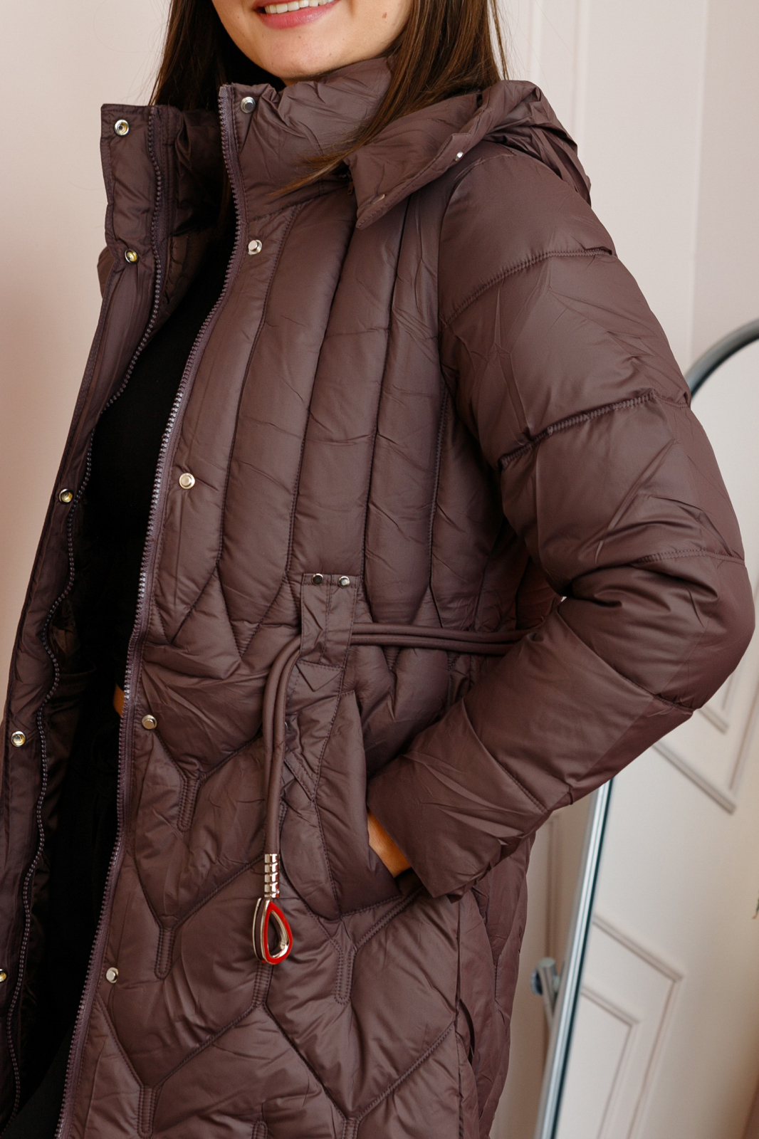 Geaca lunga matlasata Ashley cu gluga detasabila si snur in talie - Maro