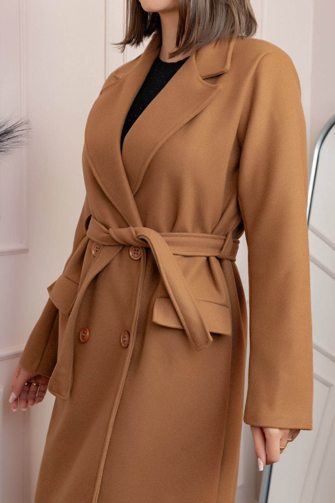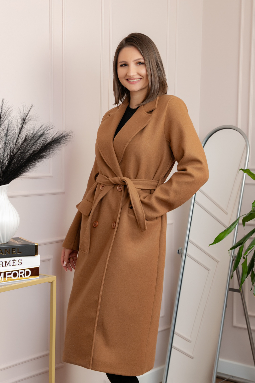Palton lung elegant Erika cu cordon si buzunare - Camel