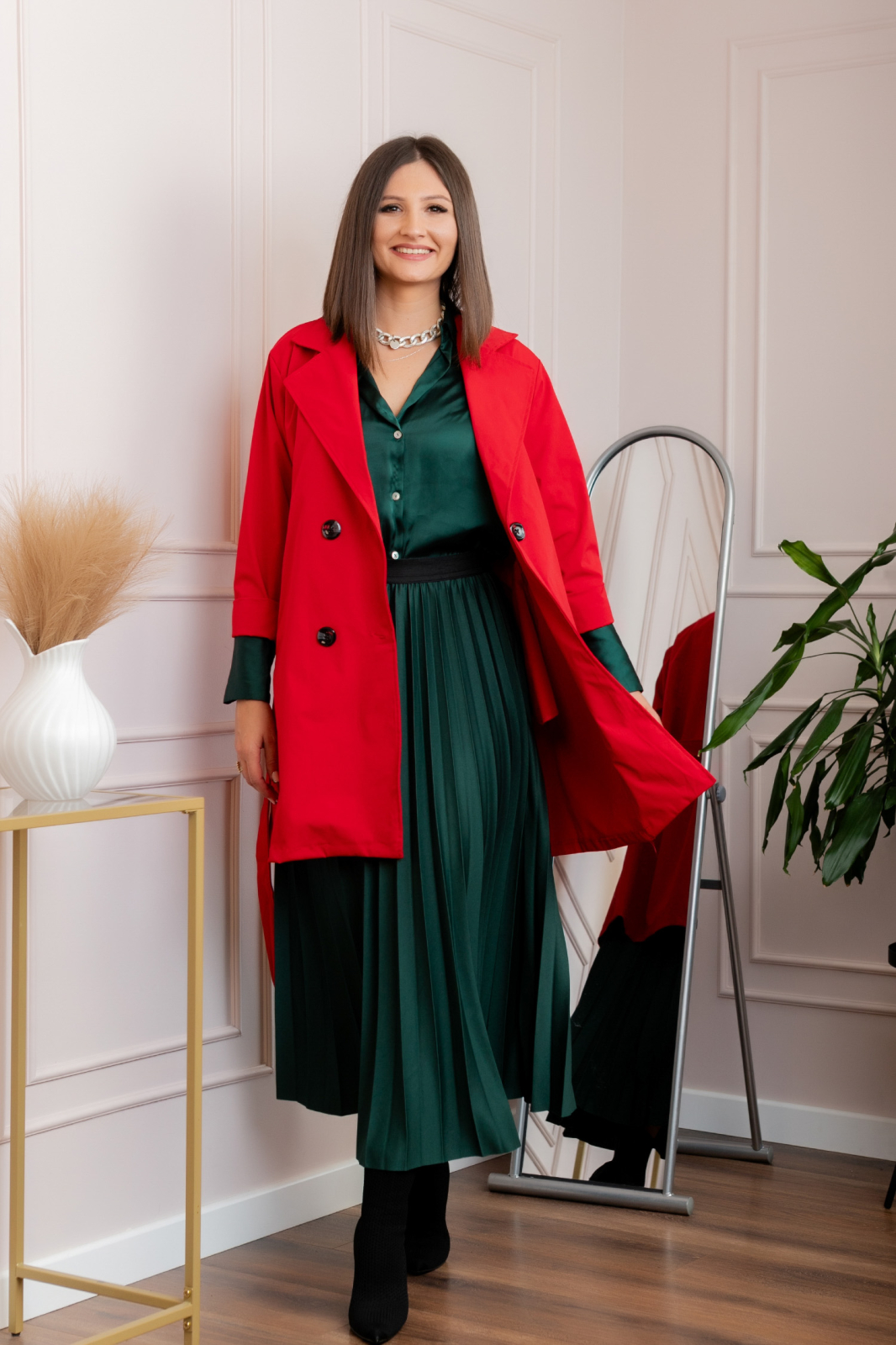 Pardesiu elegant rosu cu cordon si nasturi
