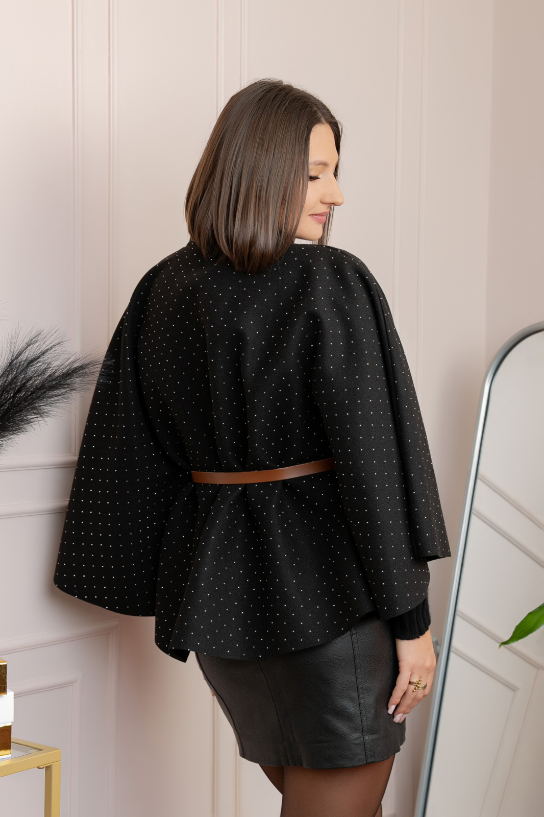 Poncho-ul elegant cu strasuri imbina confortul unui material calduros cu eleganta detaliilor rafinate. Confectionat dintr-o stofa fina ce contine lana, acrilic si poliester, ofera un aspect sofisticat si o purtare placuta in sezonul rece. Croiul amplu avantajeaza orice silueta, iar curelusa subtire din talie permite ajustarea pentru o forma feminina. Nasturele decorativ de la gat adauga o nota chic, iar strasurile fine creeaza un efect discret, dar elegant. Perfect pentru tinute de zi sau de seara, cand vrei sa te simti confortabil si sa arati impecabil.