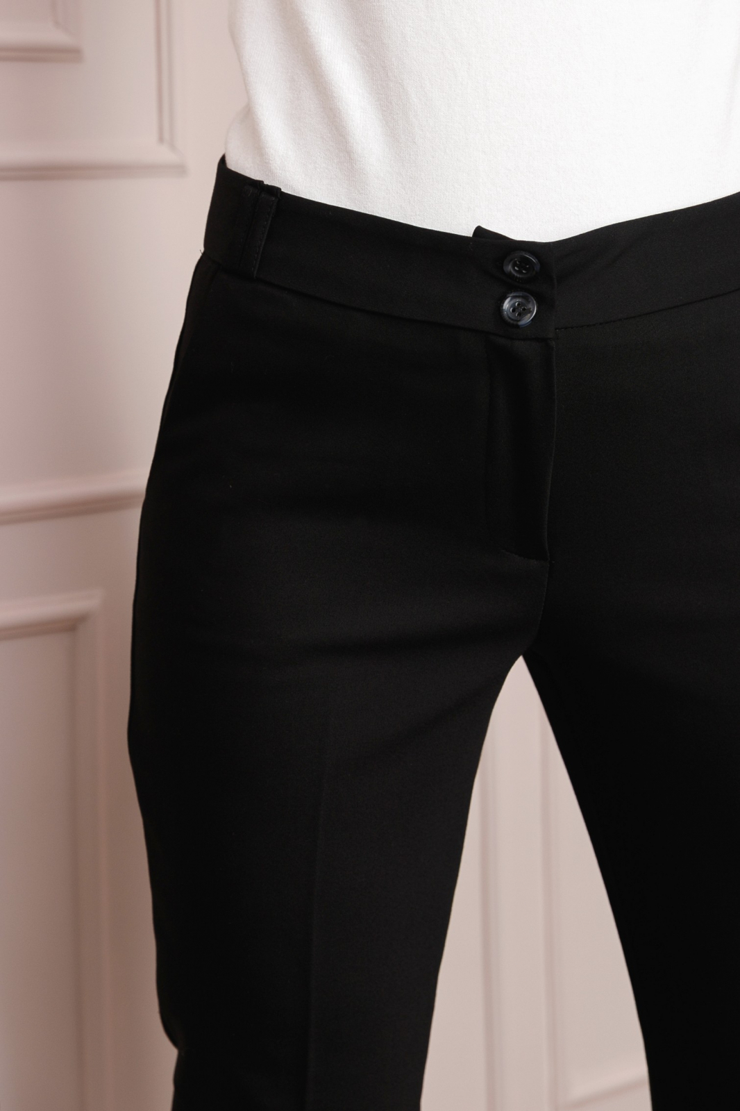 Pantaloni negri eleganti cu dunga si talie normala. Au buzunare functionale pe fata si buzunare decorative pe spate, croi conic si inchidere cu fermoar si nasturi. Pot fi asortati atat cu pantofi cu toc eleganti, cat si cu balerini.