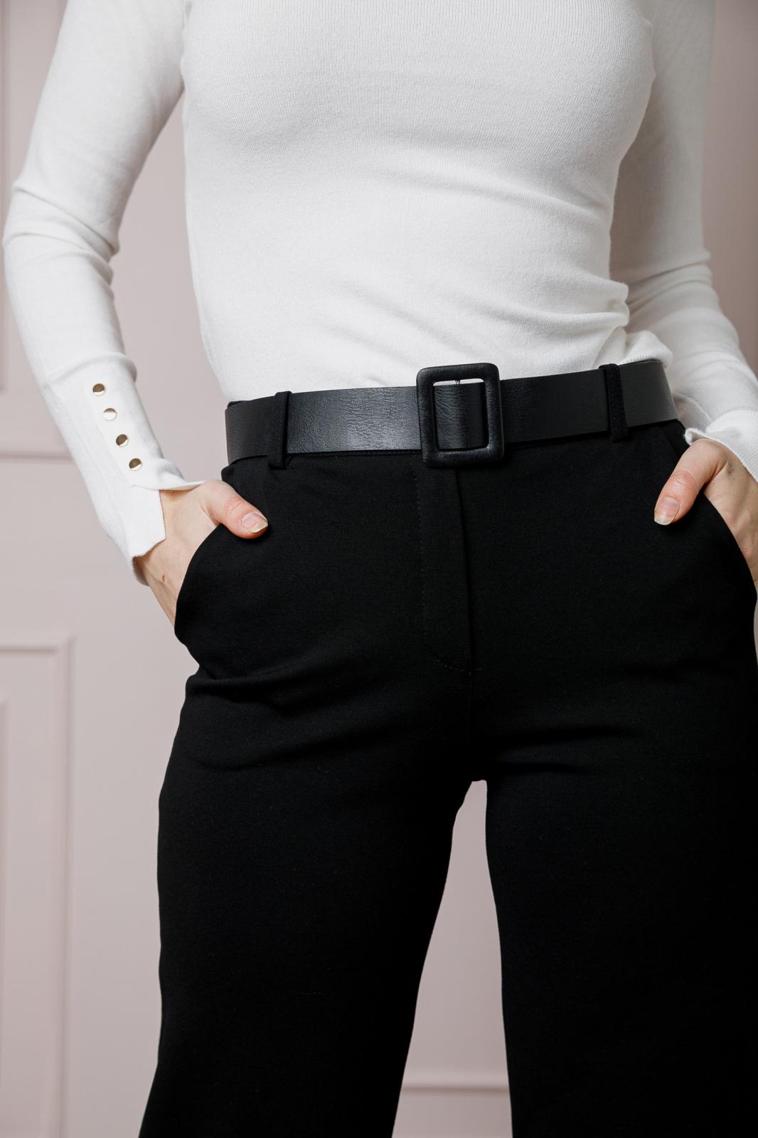 Pantaloni negri eleganti cu talie inalta si croi evazat. Sunt prevazuti cu inchidere clasica cu fermoar si nasture, curea in talie si buzunare laterale functionale.